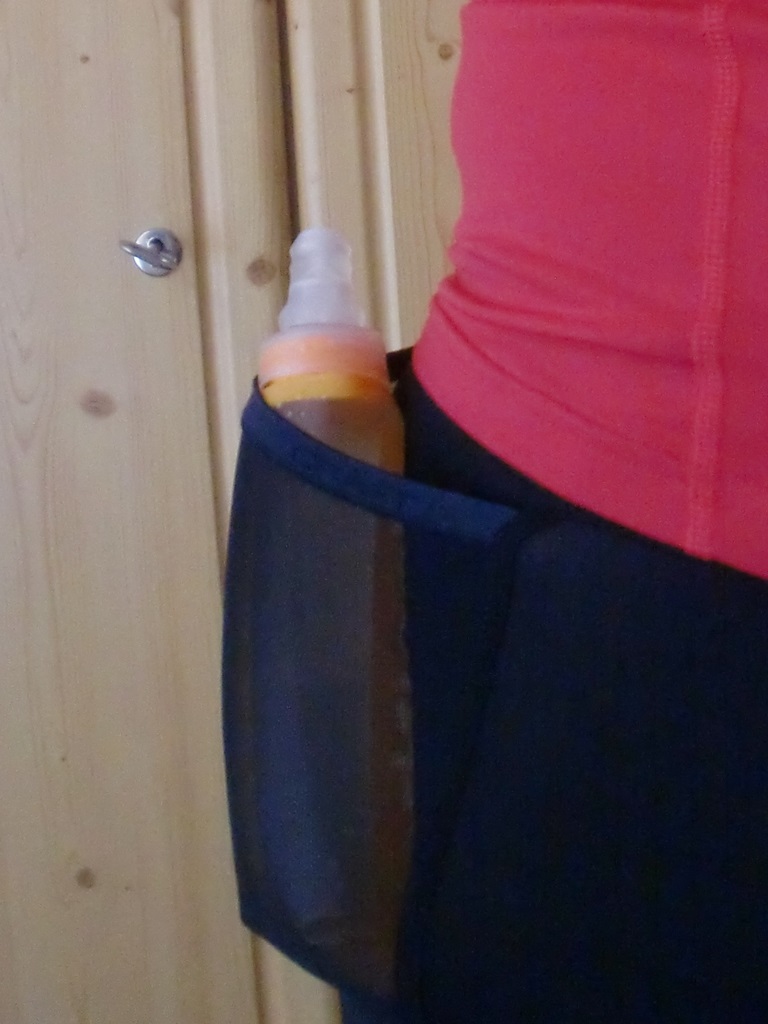Die Soft Flask Größe auf dem Foto ist 8 fl oz, das sind ca. 236 ml. Kommt natürlich auf die Größe der Taschen an. Bei mir passen sie voll gefüllt gerade so rein. Es kommt auch drauf an wie man mit den Armen schlenkert, da kann man durchaus leicht anecken. Da ich die Arme recht angwinkelt nach oben halte stört es mich nicht. Im Winter stecke ich die Teile auch manchmal in die Jacken- oder Westentasche, aber in den Tights halten sie einfach am Besten.
