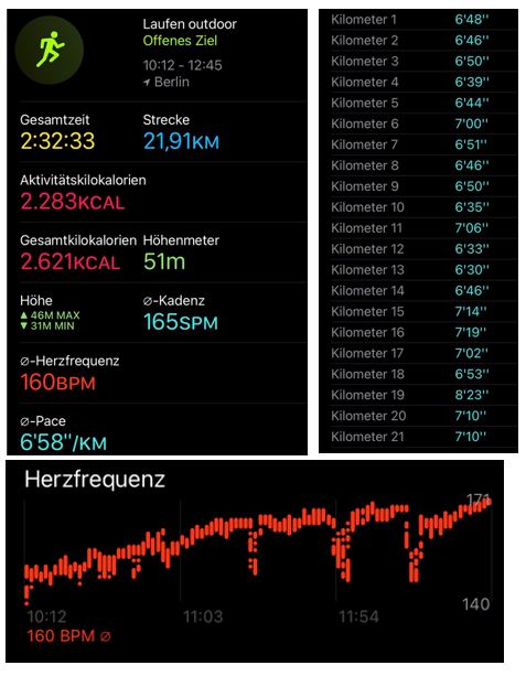 Danke nochmal für euren Zuspruch: Den zweiten HM (auf „Tempo“) in Köln am 03.10. werde ich sechs Wochen später nach meiner Premiere in Berlin am 22.08. laufen. In Köln will ich mal schauen, was geht. Die 2:10 Stunden sind glaube ich schon drin. Bis Anfang Oktober werden ja noch viele Kilometer hinzukommen, die Pace auf Strecken bis 10-12 km habe ich ja jetzt schon und ich orientiere mich so ab 5 Wochen vorher an dem Steffny Plan. Vielleicht findet sich auch noch ein Rennen 10km in 59 Minuten wie im Plan vorgeschlagen.