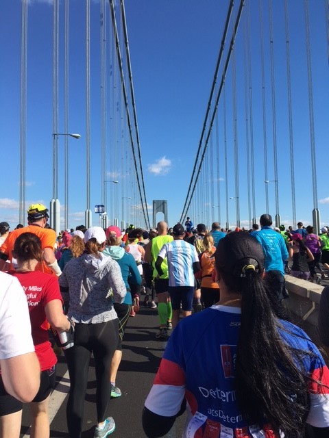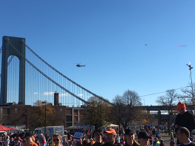 Unser Aufenthaltsbereich, im Hintergrund ist die Verrazano Bridge, eine andere Startwelle läuft hierbei : Irgendwann war dann unsere Startgruppe dran. Ich hatte das große Glück, wieder oben auf der Verrazano Bridge starten zu dürfen. Wir standen, es wurde wieder die Nationalhymne gesungen und dann sollte eigentlich der Song von Frank Sinatra erfolgen, sein New York New York. Nun ja, die erste Zeile kam, dann starb der Gesang ab. Es fanden eh alle lustig und so kam der Startschuss und ab ging es.