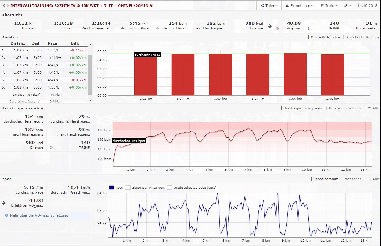 Gestern stand die Königsdisziplin an: 6x5min @ 10erWKT (4:46 pace) mit 3min TP an.
