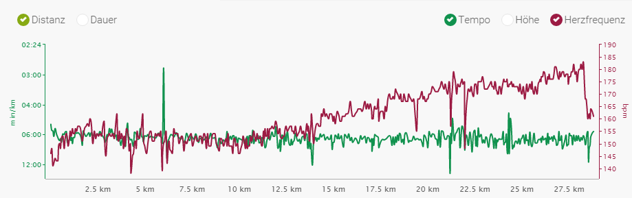 Bis KM 18 war der höchste Puls 140, super. Ab dann ging es stetig nach oben bis 159 bei KM 34.