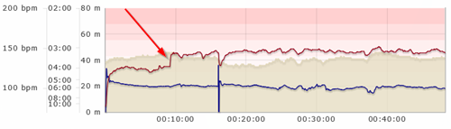 Das Fiese daran: Für sich gesehen sieht die rote Pulskurve absolut plausibel aus, es gibt sogar den typischen kurvenförmigen Anstieg. Nur halt etwa 20 Schläge daneben. Und - ja, ich kenne meine Herzfrequenz so gut, dass ich sicher bin, dass die Handgelenksmessung und nicht der externe Sensor falsch lag.