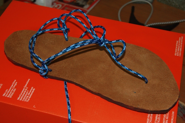 Das ist mein erster Versuch von DIY Huaraches. Nichts aufregendes oder besondes schön, aber irgendwie muss man ja anfangen. Verwendet habe ich 4,5 mm Vibram Claw und 5 mm Polyesterkordel (beides von extremtextil.de).