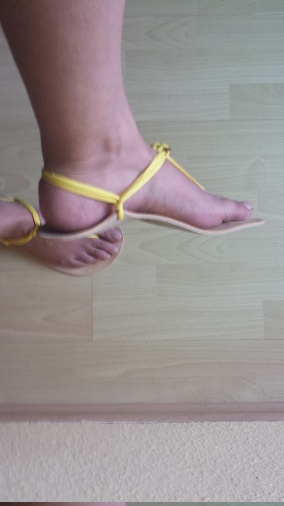 Die perfekte Bindung habe ich noch nicht heraus gefunden, auch stört das Band zwischen den Zehen und der Knoten auf der Unterseite noch ein wenig. Bin aber bislang auch nur ein paar Mal und nie länger als 2Km am Stück damit gelaufen.