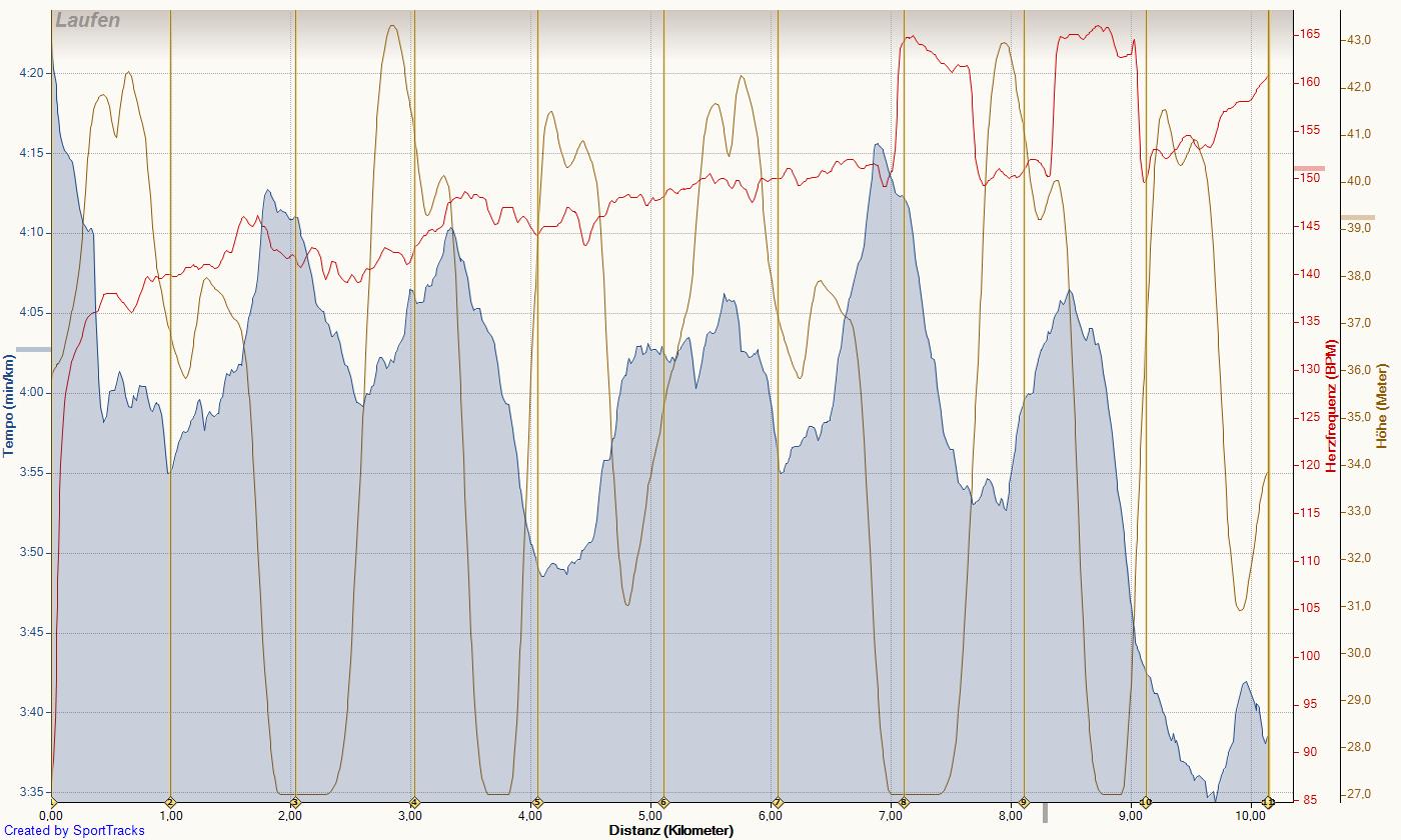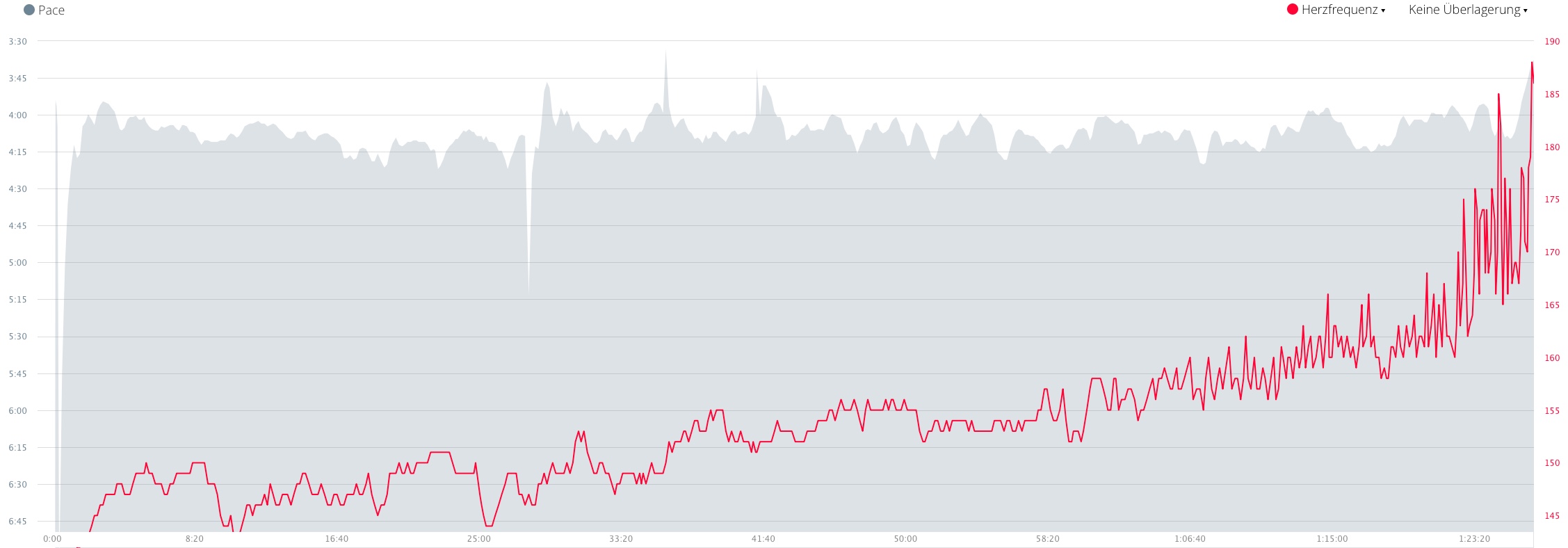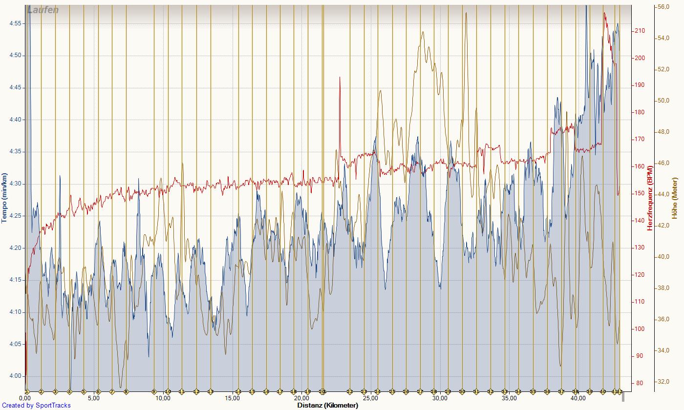Bei einem HM-Wettkampf vor 9 Tagen sah ich erstmalig Zackenausschläge bis 188 in den letzten zwei Minuten des Rennens, nur der zweite korreliert mit einer Tempoverschärfung. Das wären also 11 Schläge mehr als mein angenommener Maximalpuls. Ich habe es für Messfehler gehalten, zumal das Niveau nach dem Zacken in einem 15sec Zeitfenster dann wieder auf 164 zurückgeht, was mit der gefühlten Anstrengung sehr gut einherging, es war nicht ein Gefühl von ‚an absoluten Anschlag’ laufen (auch wenn es die WK-Endphase war). Beim 35er Lala dann bis km 34 ein Maximum von 161, in den letzten 20sec dann ein plötzlicher Anstieg um 20 Schläge auf 180, ohne Endpurt o.ä., der das erklären könnte.