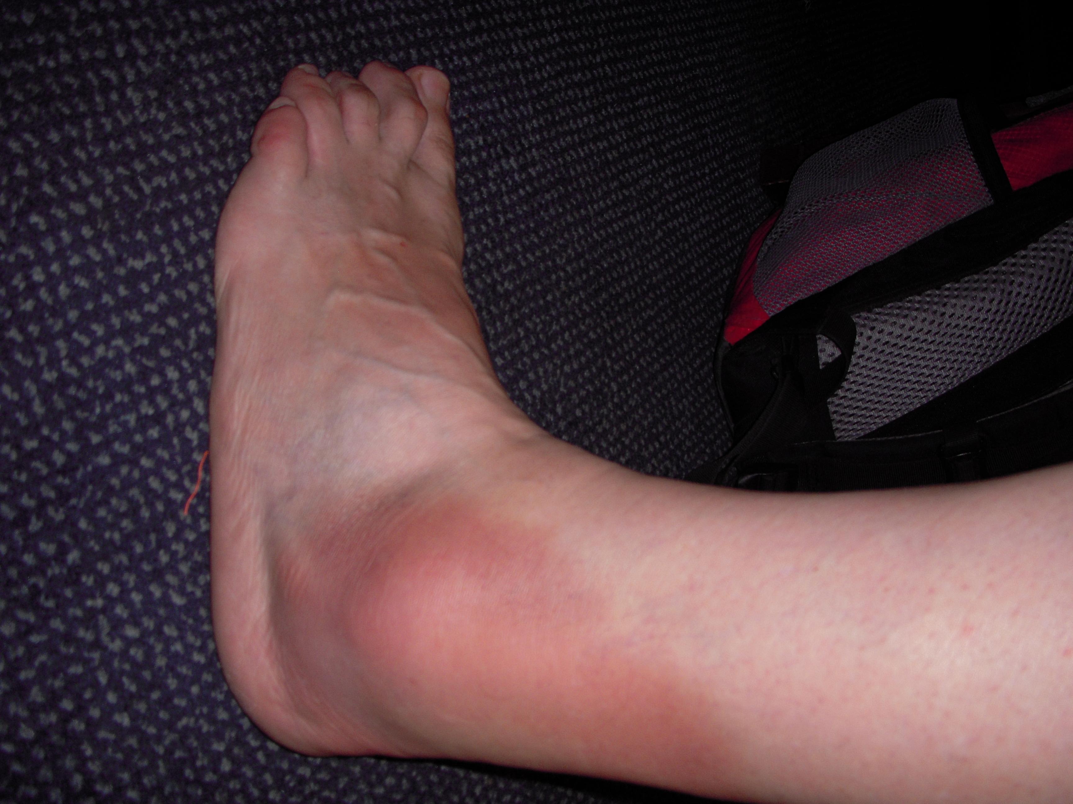 So sah z.B. mein linker Knöchel nach einem Muskelfaserriss in der linken Wade aus, den ich mir blöderweise beim Marathon nach einem Drittel der Strecke zugezogen hab. :klatsch: Es war dabei genau der von Tommi beschriebene plötzlich auftretende stechende Schmerz :teufel: und neben der klassischen PECH Therapie, d.h. Pause, Eis, Compression und Hochlegen, gibt es eigenlich kaum Alternativen.