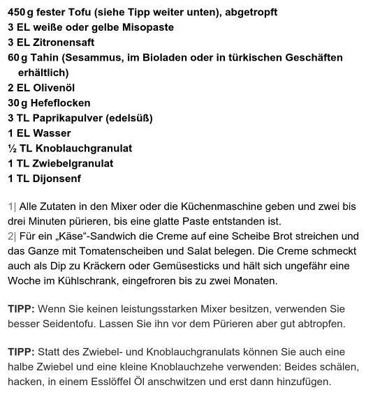 Canumarama hat geschrieben:Alleskönner-Paste à la Scott Jurek (Western-States-Streichkäse, Eat&Run, Seite 143) auf selbstgebackenen Brot mit gerösteten Sojakernen von Seeberger. Schmeckt morgens wie abends und auch ohne Hunger.