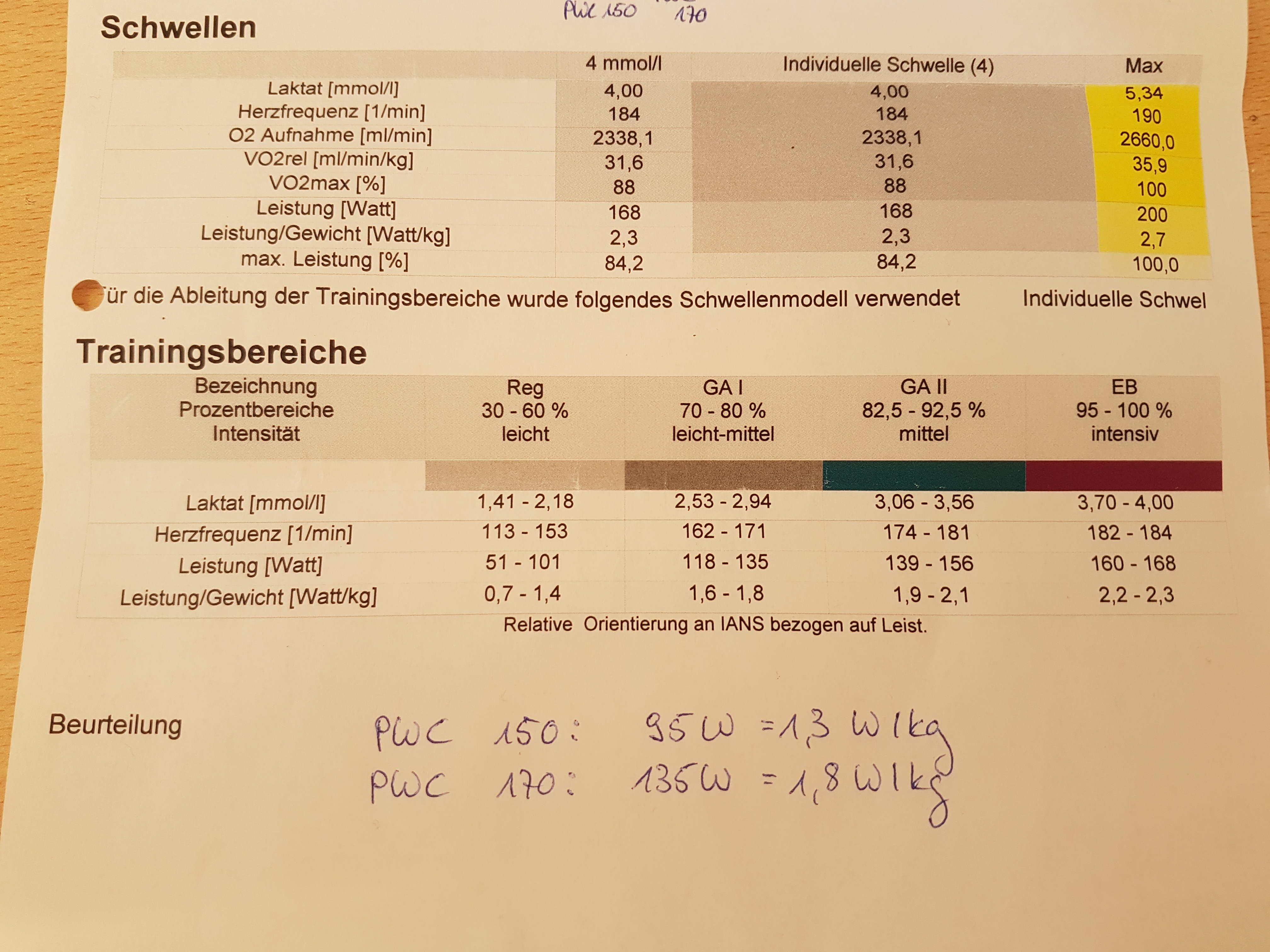 Wenn du ein paar kg abnimmst, ist der relative PWC besser, weil die Leistung durch das Körpergewicht gerechnet wird. Das wirkt sich dann auch auf deine relative VO2max aus (VO2rel), die ist genauso miserabel.