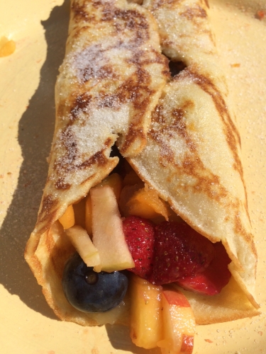 Wenn ich die mache, gibt es Eierkuchen mit Quark, heißen Kirschen, Kirschsoße, Schokosoße, Mandel/Krokantsplitter. Selten auch mit Schlagsahne. Noch lieber - jedoch seltener - mit Blaubeeren.