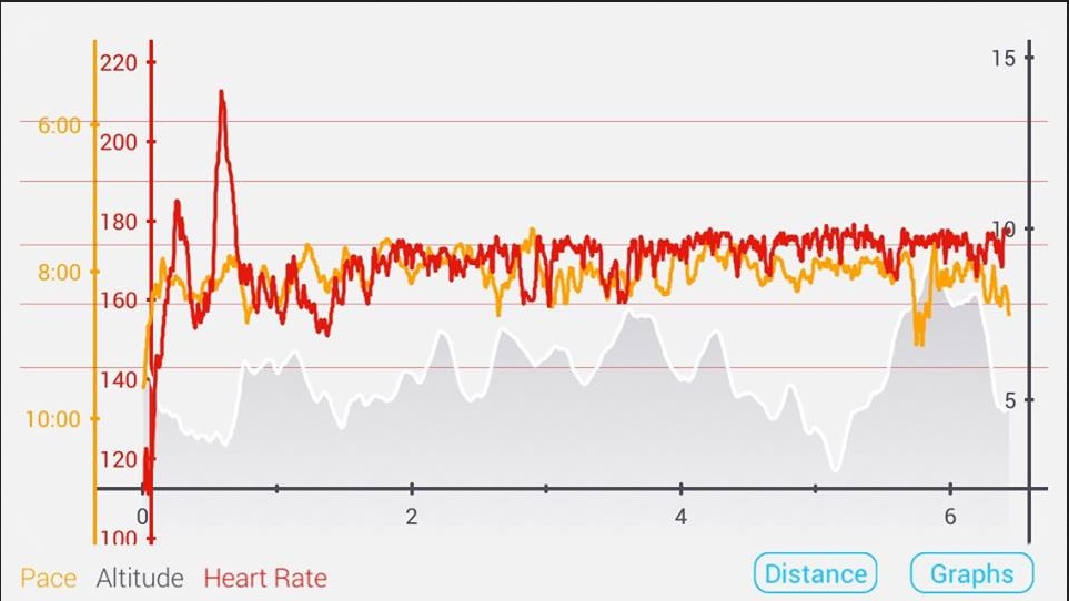 Danke Thomas. Das ist ein optischer Sensor (Scosche Rhythm+) den ich am Unterarm nahe am Ellenbogen trage. Vor dem Lauf trage ich den sicher eine halbe Stunde drinnen um ihn erstmal aufzuwaermen und sicher zu sein dass er nicht zu fest oder zu locker sitzt. Und ja, ich dachte urspruenglich auch die Spitzen kaemen vielleicht von der kalten Luft. Mein 5-6km Pace liegt zur Zeit bei etwas unter 7.40min/km (ich bin echt so langsam) aber heute bin ich mal langsam gelaufen um zu sehen ob ich das Tempo laenger halten kann da ich am Sonntag einen 16km Lauf habe und den nicht so chaotisch angehen will wie das letzte Rennen. Das ging zumindest gut und die Schnellheit konnte ich gut halten, und der Puls machte auch keine echten Kapriolen mehr. Ich muss aber sagen dass mir schon seit Jahren beim bergauf gehen die Luft wegbleibt und ich nach wenigen Schritten erstmal stoppen muss um durchzuatmen, und gefuehlsmaessig den Puls zu beruhigen. Ich muss mal mit dem Sensor schauen ob dabei etwas seltsames passiert.