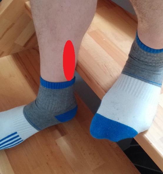3. Das auf dem Bild markierte, ist die Tibialis Posterior Sehne. Dieser Muskelsehnenstrang ist durch dein Übergewicht und geringe Lauferfahrung überlastet. Dazu kommt, dass durch das Tragen von Schuhen der Muskel degeneriert. Ich empfehle diese Übung: