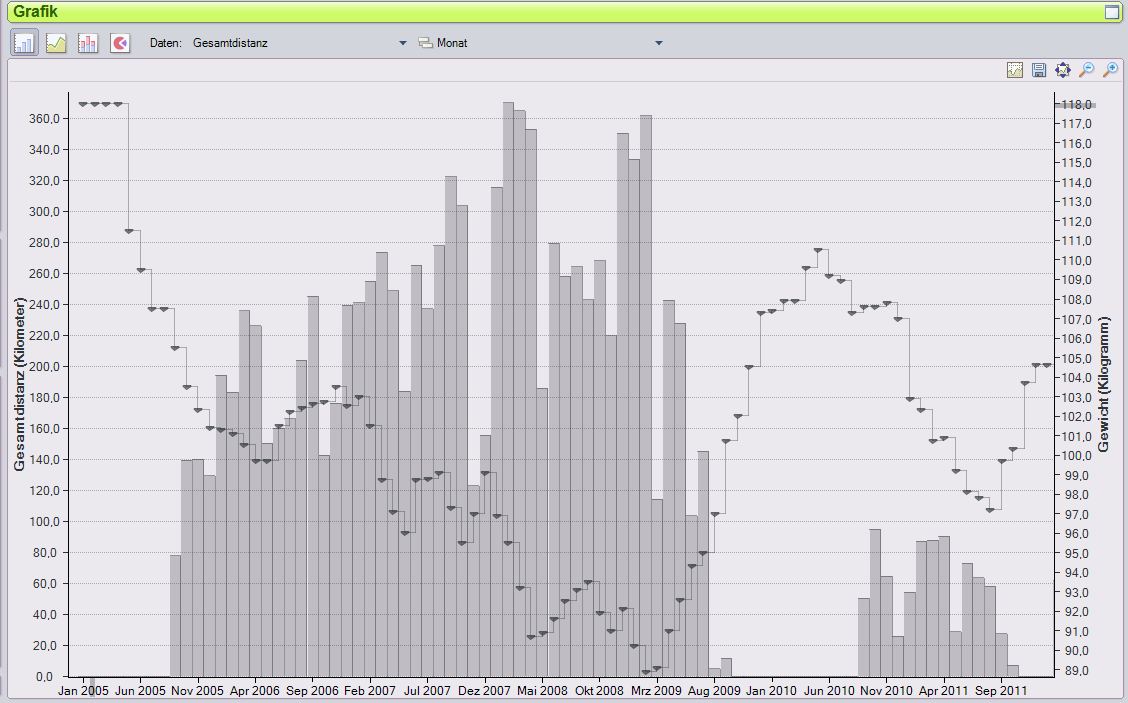 Bis ich mir im Dezember mal die Daten zu Trainingsdauer pro Monat ansah und im Vergleich dazu die Gewichtskurve. Da wurde mir so Einiges klar. Völlig unbemerkt ging die Trainingsdauer ab September runter und das Gewicht (dieses leider deutlich bemerkt) rauf.