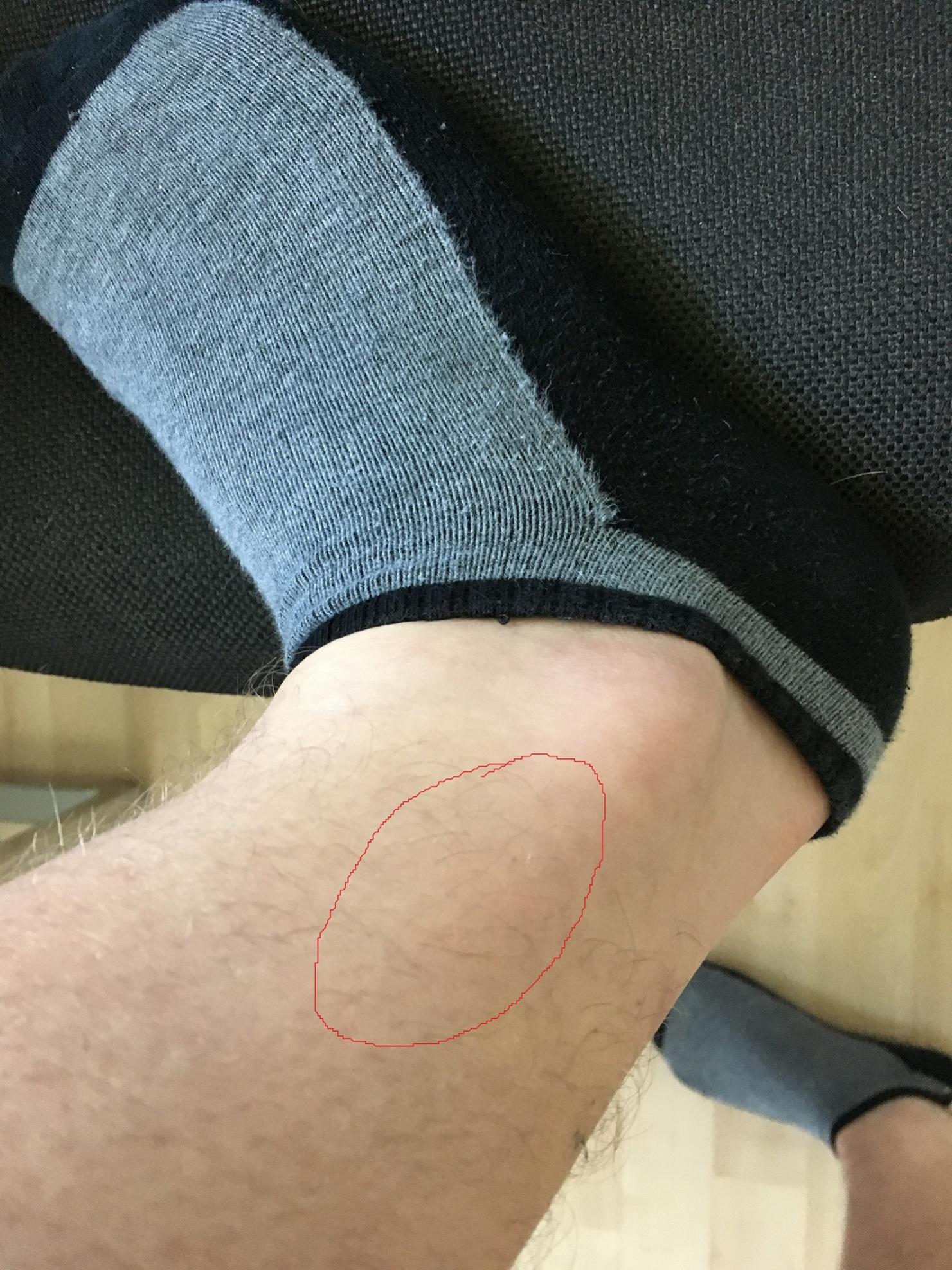 Vor ca. 4 Wochen habe ich mein letztes Spiel gepfiffen. Ich ging ohne Schmerzen in das Spiel und kam vorerst auch ohne raus. Nach dem Heimfahren ging es dann richtig los: Ich konnte auf mein rechten Fuß nicht mehr auftreten. Kühlen, Quarkumschläge etc. halfen garnichts. Ich ging ein paar Tage später zum Arzt und er verschrieb mir Diclofenac. Nach zwei tägiger Einnahme konnte ich wieder halbwegs normal gehen und dachte laufen geht auch wieder ... von wegen. Während des Laufens schmerzt die auf dem Bild eingezeichnete Stelle höllisch (Stechen).