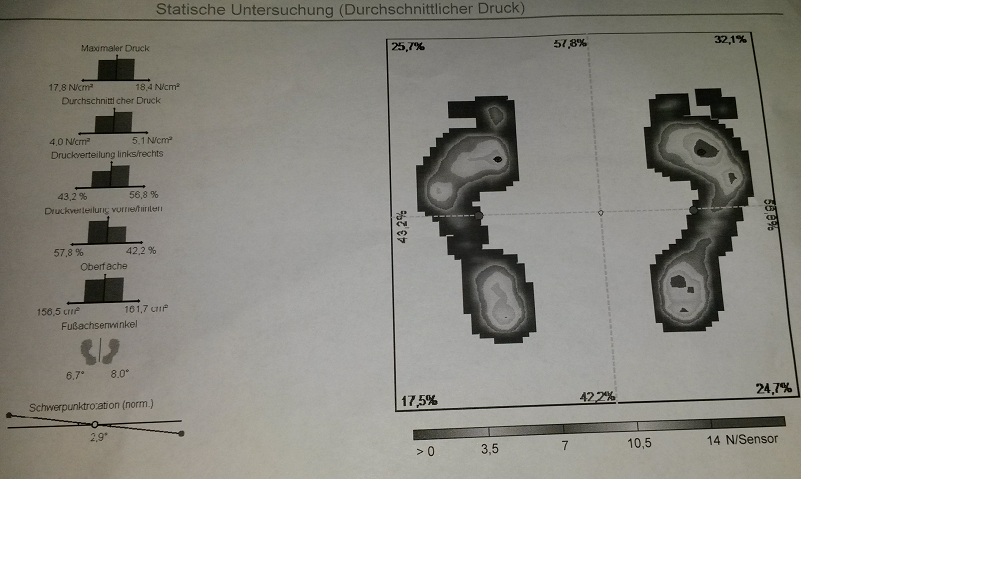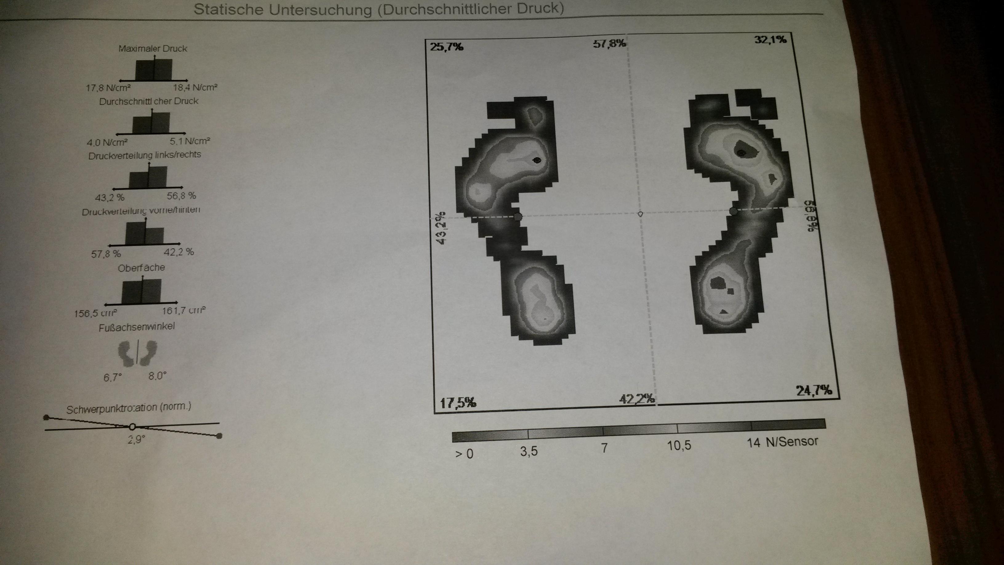 Diesmal mit dynamischer Fußdruckmessung. Laut seiner Aussage "Senkspreizfuß", laut Diagramm belaste ich beim gehen links den Ballen mit 100(0)N, rechts nur mit 75(0)N.