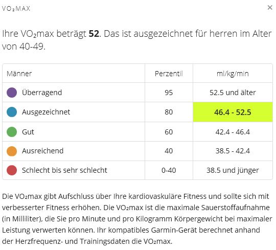 Mein Garmin 235 zeigt mir eine VO2max von (derzeit) 53 an und sagt mir ich gehoere zu den oberen 5% der Bevoelkerung. Mir ist klar dass a) die Messung heute am Rad erfolgt ist heute und b) die Garmin Messung wohl auch nicht sooo exakt ist. Aber dass das Ganze derart auseinanderdriftet?