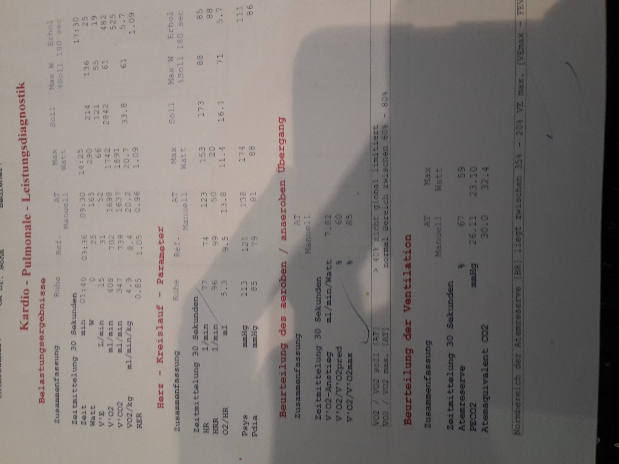 Habe dann heute eine Ergospirometrie machen lassen. Allerdings auf dem Rad nicht Laufband mit entsprechender Atemmaske Ergebnis war doch seher ernuechternd. Wattzahl 295 war kein Problem es wurde jedoch eine Vo2 max von 20,7 ml/min/kg festgestellt was ja fast der eines Kettenrauchers entspicht. Desweiteren flacht der Anstieg des Sauerstoffpulses sehr frueh ab und ist nicht parallel zum Anstieg der Herzfrequenz, was auf eine nachlassende Pumpleistung hindeutet. Ansonsten liegen die restlichen Werte im Normbereich, allerdings nicht im Bereich eines (relativ) austrainierten Sportlers. Bin 47 Jahre alt, Lauftraining wie oben und auch Radfahren bis 150 km im Schnitt von ca 26kmh.