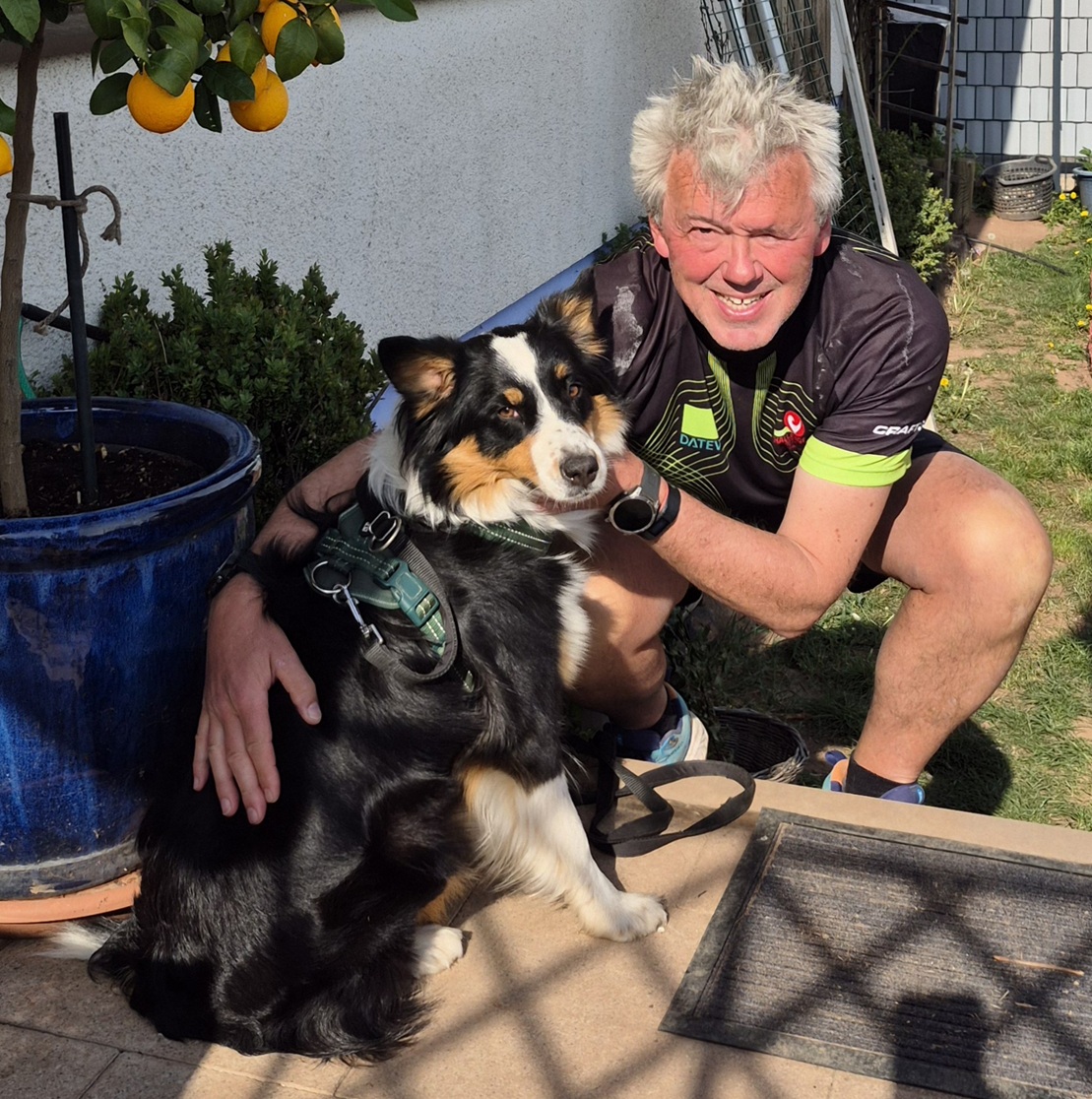 Mit auf der Fahrt ist Momi, der Australian Shepard der mich auf diversen Trainingsläufen