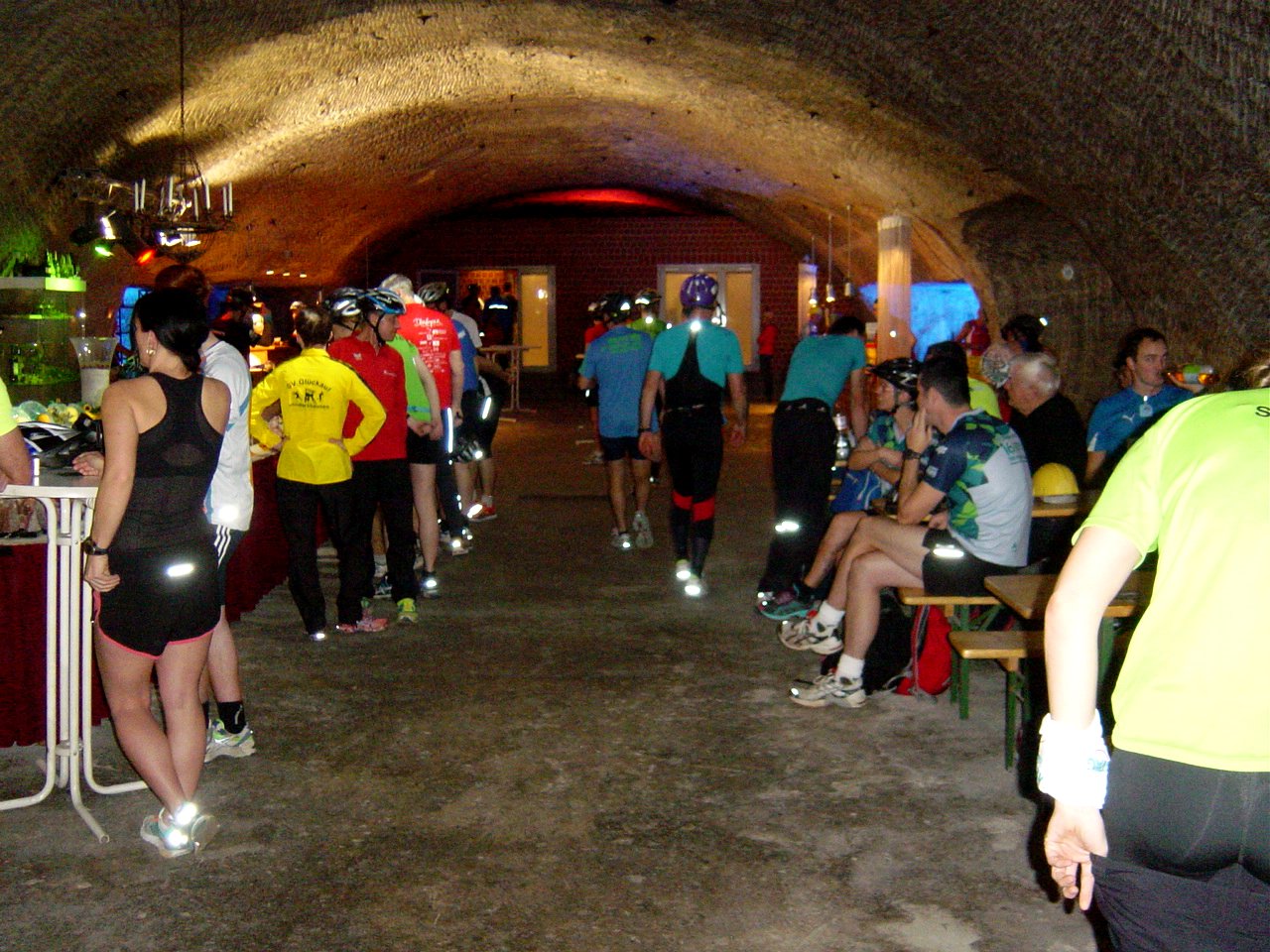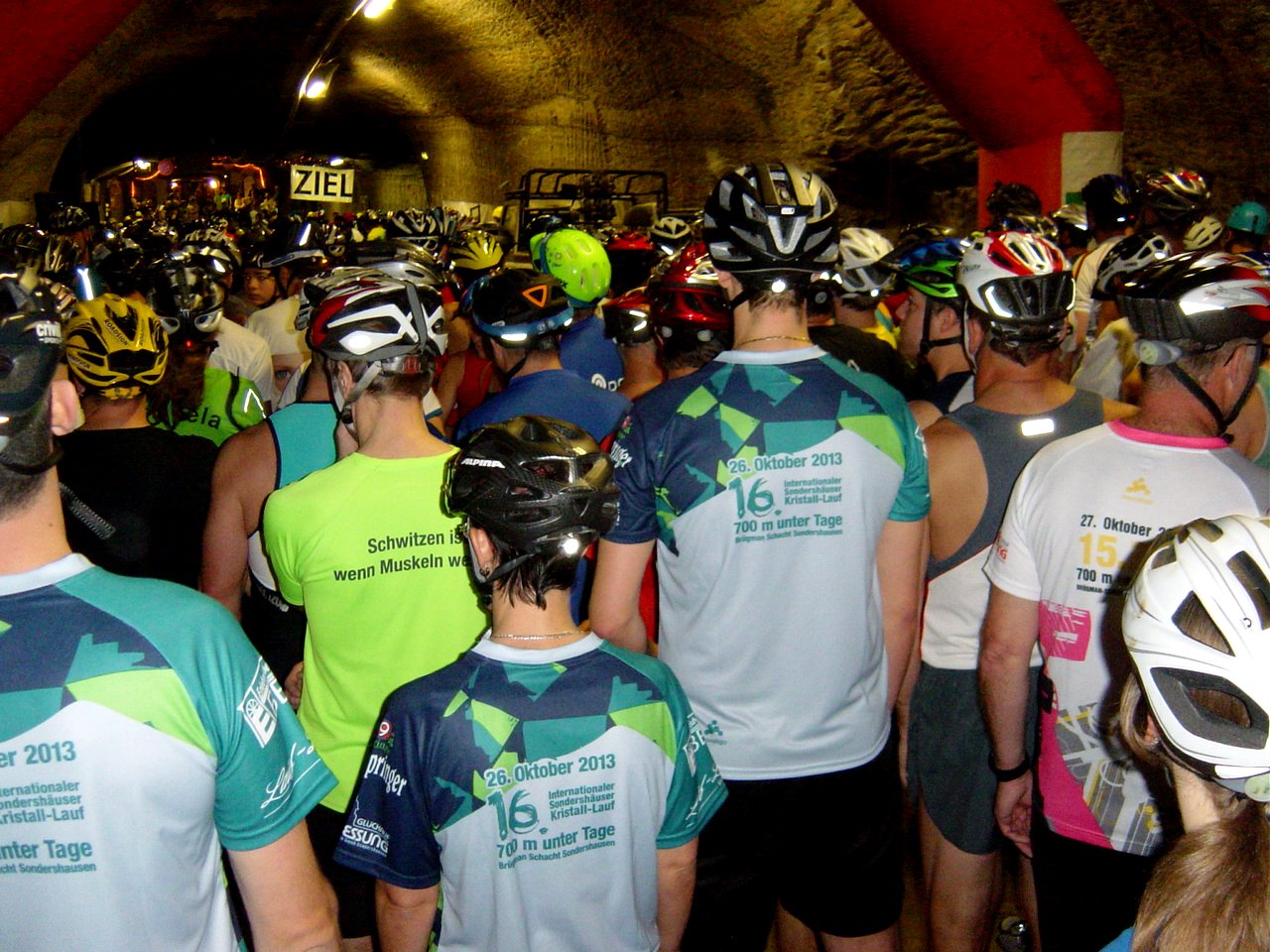 Dreißig Minuten später erfolgt tatsächlich der Start. Nach kurzer Zeit verlassen die Sportler den geräumigen und hellen Hauptstollen und tauchen in das spärliche Licht der normalen Stollen ein. Ein Schutzhelm und eine Lampe sind für jeden Starter vorgeschrieben. Diejenigen, die sonst keinen Sicherheitshelm tragen, sind gut beraten, vorher das Teil unter Praxisbedingungen zu testen. Erst recht, wenn daran noch eine Lampe befestigt wurde.