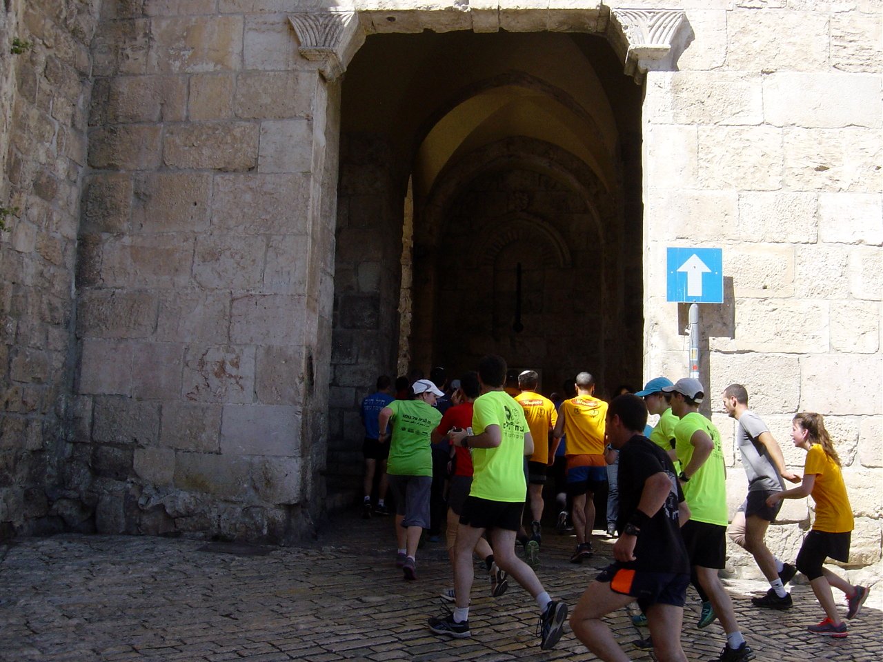 Der Berichterstatter startet um 10:10 Uhr. Zuvor haben sich schon zwei weitere Gruppen der gleichen Laufstrecke im 20-Minuten-Abstand auf den Weg gemacht. Obwohl auf den Fotos der Eindruck einer hohen Läuferdichte entsteht, ist es an den Stadttoren der Altstadt zu keinen Staus gekommen. Nach dem Passieren des Jaffators haben die Athleten Israel verlassen und befinden sich nun in dem von Israel besetzten Teil von Palästina. An den Toren stehen Soldaten mit Gewehren aber ansonsten merkt man auch am Zionstor nichts von einem Grenzübertritt.
