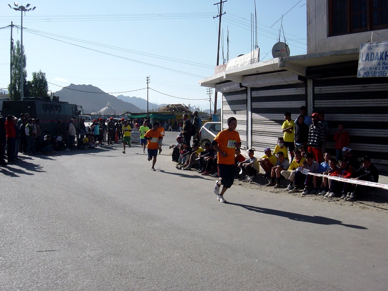Als Zieleinlaufbanner dient ein schwarzer Tuchstreifen mit der Aufschrift „Ladakh Public School“ am Zugang zum Schulhof. Ich passiere die magische Linie, nehme danach erst noch einmal richtig Fahrt auf und laufe dann langsam auf dem Hof aus. Der verspätete Endspurt ergibt sich aus der Gefällestrecke bis auf Schulgeländeniveau. Ich freue mich, dass ich angekommen bin, dass es mir gut geht und dass ich meiner Ländersammlung ein weiteres Land hinzufügen kann. Mit einem Getränk in der Hand schlendere ich zufrieden über den Campus, beobachte, fotografiere und werde von etlichen ladakhischen Athleten angesprochen. Es ergeben sich freundliche Gespräche, die leider durch die Englischkenntnisse der anderen Seite (und auch meiner) begrenzt sind. Der Platz füllt sich weiter, indische Diskomusik dominiert mehr und mehr den Luftraum über Leh und zu guter Letzt werde ich von einem indischen Zeitungsreporter interviewt.