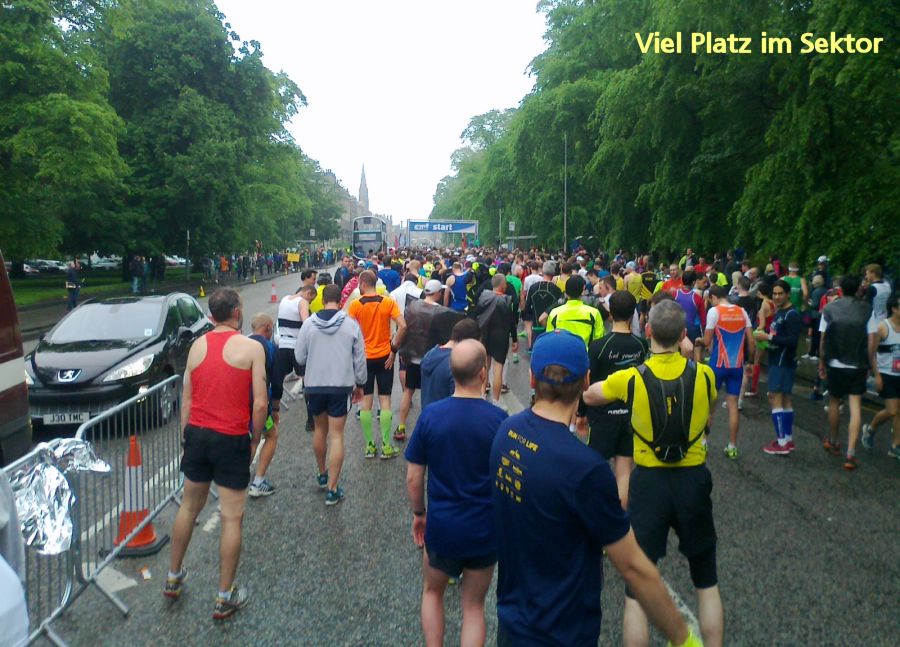 Das Startgelände ist auf zwei Straßen verteilt und ausreichend dimensioniert; einige der Briten in der Schlange beschwerten sich über die zu geringe Anzahl der Dixis, aber ich fand hier keinen Makel; habe schon viel üblere Schlangen erlebt - länger als 15min musste glaube ich keiner anstehen.