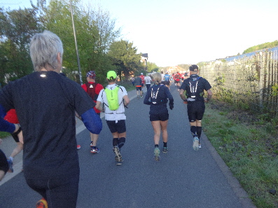 Mit knapp 200 Teilnehmer geht es Punkt 7:00 Uhr los. Gelaufen wird 2017 die Runde andersrum, also eigentlich WEHW, und nach dem Start erst mal in die falsche Richtung. Klingt komplizierter als es ist. Es geht 500 Meter bis zu einer Wendepylone und dann retour zum Start, wo uns die ersten Zuschauer schon anfeuern. Noch etwas früh für aufmunternde Sprüche. Ab jetzt sind wir richtig. Jetzt heißt es Fahrt aufnehmen, mit dem roten Teufel im Rücken (meines bewährten bekannten Motto-Shirt). Bevor ich das Laufen für mich entdeckte war ich begeisterter Bahnfreak. Schon nach wenigen Metern der erste kurze Tunnel (Dorrenberg Tunnel) und dann der 488 m lange Dorptunnel. Garmin fiept, Signal weg. Tja, da heißt es heute die ermittelten Kilometer und Pace-Werte mit Vorsicht zu behandeln. Wie es sich bald zeigen sollte hatte ich bis zum Schluss 2 Kilometer mehr auf der Anzeige, beim späteren einlesen in SportTracks wurden exakt 100 protokolliert. Nicht zu viel Gedanken machen über die Abweichungen zu den offiziellen Km-Schildern. Es liegt noch ein langer Weg vor mir, da sind außer Km-Toleranzen, noch andere unbekannte Parameter mit einzukalkulieren.