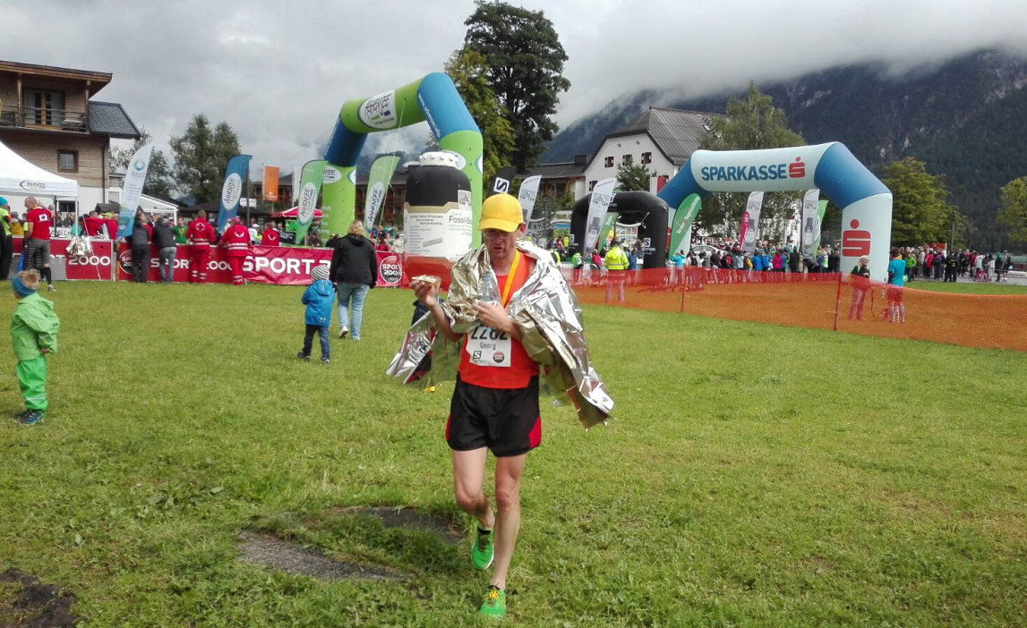 Nach dem steilen Abstieg zur Gaisalm wurde der Weg leichter und ich konnte wieder den einen oder anderen Kollegen "einsammeln". Als letzte Herausforderung musste der Breitlahngraben überwunden werden - sehr tiefer Schotter; der eigentliche Weg war dem Wasser zum Opfer gefallen und so wurden wir unten rum quer durch das Geröllfeld geleitet. Danach noch ein paar recht gemütliche Kilometer und dann endlich wieder Asphalt auf den letzten 500m; Zieleinlauf bei 1:49:26 als 63. im Klassement und 12. meiner M45-Klasse. Im Verpflegungszelt gab's Mohnstrudel, Wasser und Tee - ein Genuß!