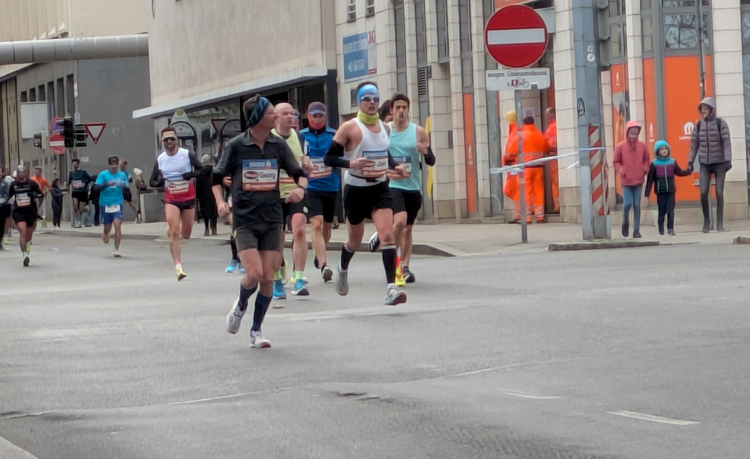Nach einem weiteren Kilometer bogen wir gegenüber vom Schwedenplatz auf die Praterstraße ein und dann ging es auf das letzte Renndrittel ... ein Transparent "Mythos Praterhauptallee" hing über der Strecke; evtl bezugnehmend auf Kipchoges sub-2h-Lauf unter Laborbedingungen an ebendieser Stelle - aber davon kann man sich als Hobbyläufer leider nichts kaufen, aus meiner Sicht sind diese elendslangen Kilometer im Prater einfach nur langweilig, eine echte Mentalprobe - auch ist das der Abschnitt mit den wenigsten Zuschauern. Zum Glück hatten wir jetzt guten Rückenwind, was die Sache erleichterte - ich konnte die Pace ganz gut halten. Kurz vor dem Stadion dann eine Extraschleife samt 180°-Wende, deren Sinn sich mir noch nie erschlossen hat - am Beginn dieses U-Hakerls lag die 30km-Matte. Zeit für km 25-30: 21:39, Pace also immer noch stabil - beim Rang allerdings hatte ich über 30 gutgemacht auf diesem Abschnitt, der war jetzt 732.