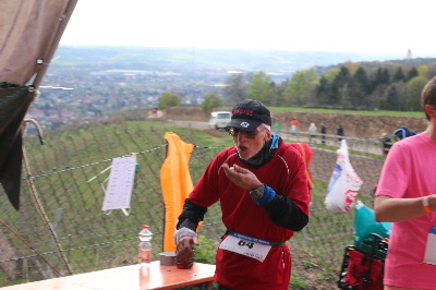 An der Strecke besteht für Zuschauer nur oben auf einer Plattform bei der Spitzhauskapelle, oder unten entlang der Straße, die Möglichkeit das Rennen zu verfolgen. Die Treppe selbst ist tabu. Der steile Weinberg neben der Treppe ist allenfalls für erfahrene Berggänger eine Option. Für die jeweils 88,4 Höhenmeter gibt es für die nächsten 24 Stunden nur einen Weg. Die Direttissima. Immer wieder passiere ich auch meinen Mann aus den (Wein)Bergen. Immer wieder laufe ich in die gezückter Kamera oder soll sogar kurze Statements abgeben. Allerdings habe ich keinen Nerv dafür das Tempo rauszunehmen oder gar anzuhalten. Ich will so viel wie möglich Runden sammeln ehe mich die Müdigkeit und die Stille der Nacht zermürbt. Aber es läuft weiterhing gut. Ich finde meinen Wohfühlrhythmus, laufe meine beständigen Rundenzeiten und solange es noch hell ist, nehme ich bergab die Stäffele im Doppelpack. Als es gegen 19:30 Uhr dämmert gehen die gelblichen Laternen an der Treppe langsam an. Ich bin etwas enttäuscht ob deren Leistung. Stellenweise sind die Stufenschatten irritierend. Als zudem stark kurzsichtiger Gleitsichtbrillenträger muss ich mich nun verdammt gut konzentrieren um mir abwärts keinen Fehltritt zu leisten. Lichttechnisch bin ich etwas verwöhnt gewesen von der gut ausgeleuchteten „Heimatstaffel“ mit ihrer hochmodernen LED Lichttechnik. Bevor sich Abgründe auftun passe ich meine Schrittfolge der Aufstiegstechnik an und nehme damit natürlich auch Tempo raus. Die Zeit bis ich einmal das „Murmeltier“ bei Günter gemacht habe wird länger, bleibt aber konstant die nächsten Stunden. Und an Pausen denke ich noch lange nicht. Wozu auch. Günter wird als V-Mann eingesetzt. V wie Versorgung - und erhält alsbald seinen ersten Cateringauftrag. Ich brauche mehr Energie als die kleinen Häppchen der Müsliriegel und Bananenstückchen, die ich stetig am höchsten Punkt der Strecke hastig einwerfe. Also wird der Butlerdienst geschickt die leckeren Tütchen-Spachtelmassen am Walk-Inn bereitzustellen. Nachgespült wird an der Tankstelle am unteren Umkehrpunkt, die sich bei der nipponschen Reisschüssel auf vier Rädern befindet.
