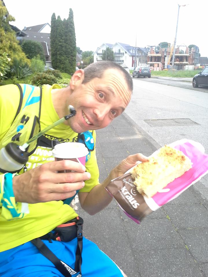 Bald nach dem ersten VP ist irgendwo hinter Roggendorf-Thenhoven der erste Marathon schon geschafft. Die Zeit weiß ich nicht mehr, denke mal so rund 5 Stunden. Ich merke meine Beine schon, aber alles gut. Weiter gehts nach Esch, hier erleben wir den bittersten Moment der ganzen Tour. In Esch kommen wir an einem Edeka vorbei, der eigentlich noch geschlossen hat, sehen aber zum Glück wie Leute mit Brötchentüten aus einer Nebentür aus der Bäckerei herauskommen. Juhu, wir stürmen freundestahlend den Laden. "Gibt's schon Kaffee?" "Nein, die Kaffemaschine ist leider kaputt." Kaputt, NEEEIIIN!!! Entsetzen in unseren Gesichtern, wir stehen wie versteinert da, bis die Verkäuferin meint "Nur ein Scherz, natürlich gibt's Kaffee". Erleichterung, puh, klasse gemacht von ihr und es hat ja genau die richtigen getroffen. Mit Kaffee und frischen Teilchen geht es wieder auf die Strecke. Der Morgen ist gerettet.