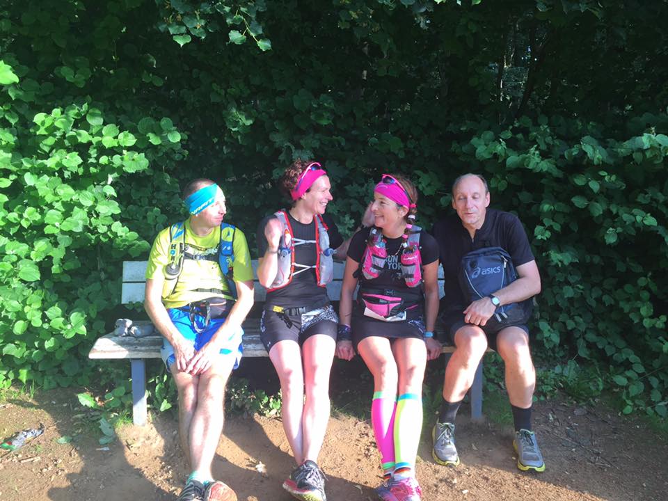Das Zeitlimit für die Runde beträgt 32 Stunden. Unser Ziel war anzukommen, irgendwie, deshalb wollen wir bewusst langsam starten. Wir, das ist zunächst eine Vierergruppe mit Betty, Jessy, Rene und mir. Dazu gesellte sich etwas später noch Andreas. Eine harmonische Truppe, was das Läuferische und das Menschliche angeht hat es super gepasst. Wir haben die Sache locker gesehen, ohne auf jede Minute Zeitverlust zu achten, aber schon mit der nötigen sportlichen Ernsthaftigkeit. Und jeder der beim Kölnpfad mitläuft, der macht so einen langen Lauf nicht zum ersten mal, weiß also, worauf er sich einläßt. Zu unserer 5'er Gruppe gesellten sich zwischenzeitlich Freunde, die ein Stück mit uns mitgelaufen sind oder uns auf dem Rad begleitet haben. Aber auch immer mal wieder andere Läufer, die in etwa in unserem Tempo unterwegs waren. Wie das halt bei so einem Lauf üblich ist, Geselligkeit wird gesucht, das macht es einem unterwegs einfacher. Aber letztendlich muss jeder sein Tempo laufen, sonst hat man keine Chance.
