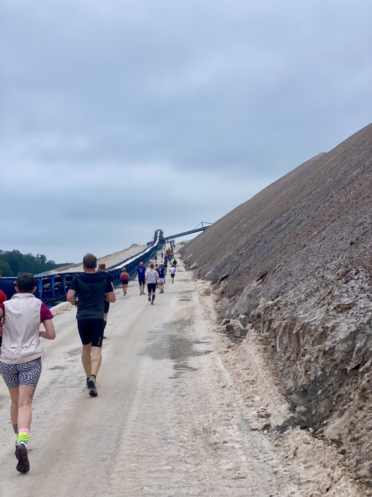 Am Werkstor wurden wir mit einem herzlichen „Glück auf“ begrüßt und dann ging es über Beton-plattenstraßen weiter über das Werksgelände. Nach ca. eineinhalb Kilometern Laufstrecke geht es dem Förderband folgend stur geradeaus Richtung „Berg“. Bei dem Berg handelt es sich um nichts anderes als eine riesige Abraumhalde.