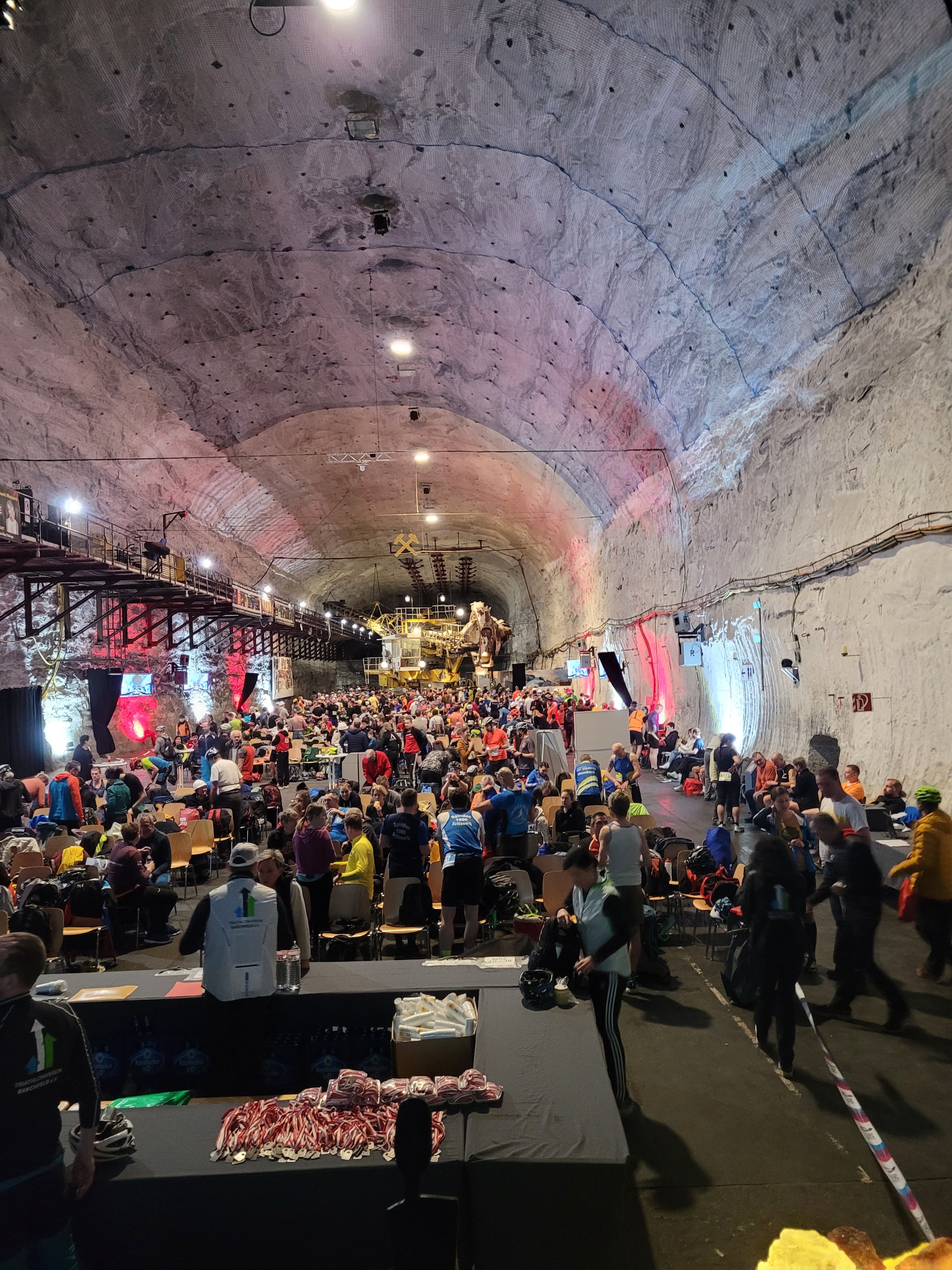 Nach einigen Minuten "rasanter Fahrt" steigen wir an einer Haltestelle aus und laufen nochmals knapp 10min zur Halle. Das ist schon imposant einen solch großen Raum 500m unter der Erde zu entdecken. Hier finden also die Veranstaltungen statt . und gerade als wir dort eintreffen wird für die 10KM-Starter(innen) der Countdown gezählt. Ich suche mir noch einen der wenigen freien Stühle und deponiere meine Tasche dort und orientiere mich - schon kommt ein "Hallo Roland" - einer der Burger-Zwillinge begrüßt mich (jeder der viel auf MA/Ultra-Veranstaltungen unterwegs ist kennt Sie) ... und es werden so manche Laufgeschichten, Pläne, etc ausgetauscht.