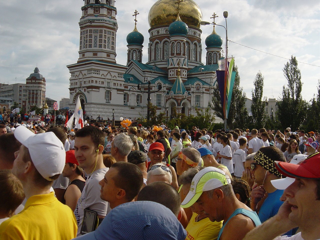Am Vortag des Siberian International Marathons (SIM) holen die 42 Sportreisenden ihre Startunterlagen ab. Bei ca. 30 Grad Celsius und nur leicht bewölktem Himmel machen sie sich zu Fuß auf den Weg vom Hotel Flagman bis zum Kathedralenplatz/Ecke Krasny Put´ (Startplatz des SIM, max. 20 Gehminuten), um eine erste Orientierung zu bekommen. Von dieser beeindruckenden Landmarke „Kathedrale“ marschieren die Ausdauerläufer zur Omsker Staatsbibliothek, in der die Startunterlagen bereit liegen. Die Information über die Vorverlegung vom Start von 10:00 h auf 09:00 h aus Temperaturgründen hat die Athleten bereits erreicht und einige Teilnehmer erwägen die Ummeldung auf eine kürzere Strecke.