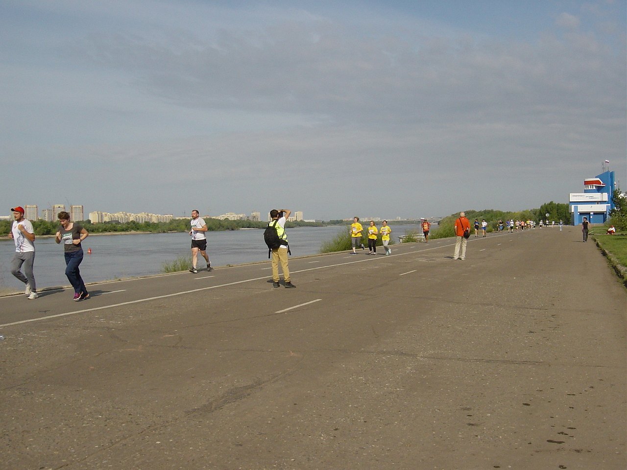 Wie bereits gesagt, ist es Samstag Vormittag und der Verkehr in der 1,2-Millionen-Stadt nicht unerheblich. Trotzdem ist der Krasny Put´ großzügig (über acht Fahrspuren) bis zur ersten Pendelstrecke abgesperrt. Hier und da gibt es ein beeindruckendes Gebäude wie die Staatsbibliothek oder eine Kirche mit goldglänzendem Zwiebelturm. Generell kann man aber sagen, dass die Stadt nicht mit Sehenswürdigkeiten überfrachtet ist. Im weiteren Verlauf der 10-er-Strecke führt der Parcours recht reizvoll in unmittelbarer Nähe am Irtysh entlang. In Blickrichtung der Läufer und in geringer Entfernung ist am Zusammenfluss von Om und Irtysh 1716 eine Befestigungsanlage entstanden, die als Grundstein der Stadt Omsk gilt. Bei km 8,5 biegen die Läufer in Richtung Stadt ab und gelangen nach einigen Ecken auf dem Krasny Put´ ins Ziel.