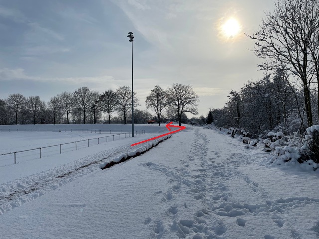 Dann, angekommen, überquert man eine kleine Brücke vom Parkplatz auf das Sportgelände und auf dem Höhepunkt überblickt man die Laufstrecke... es folgt... der Schneegasmus!!! Eine Symphonie in Weiß.