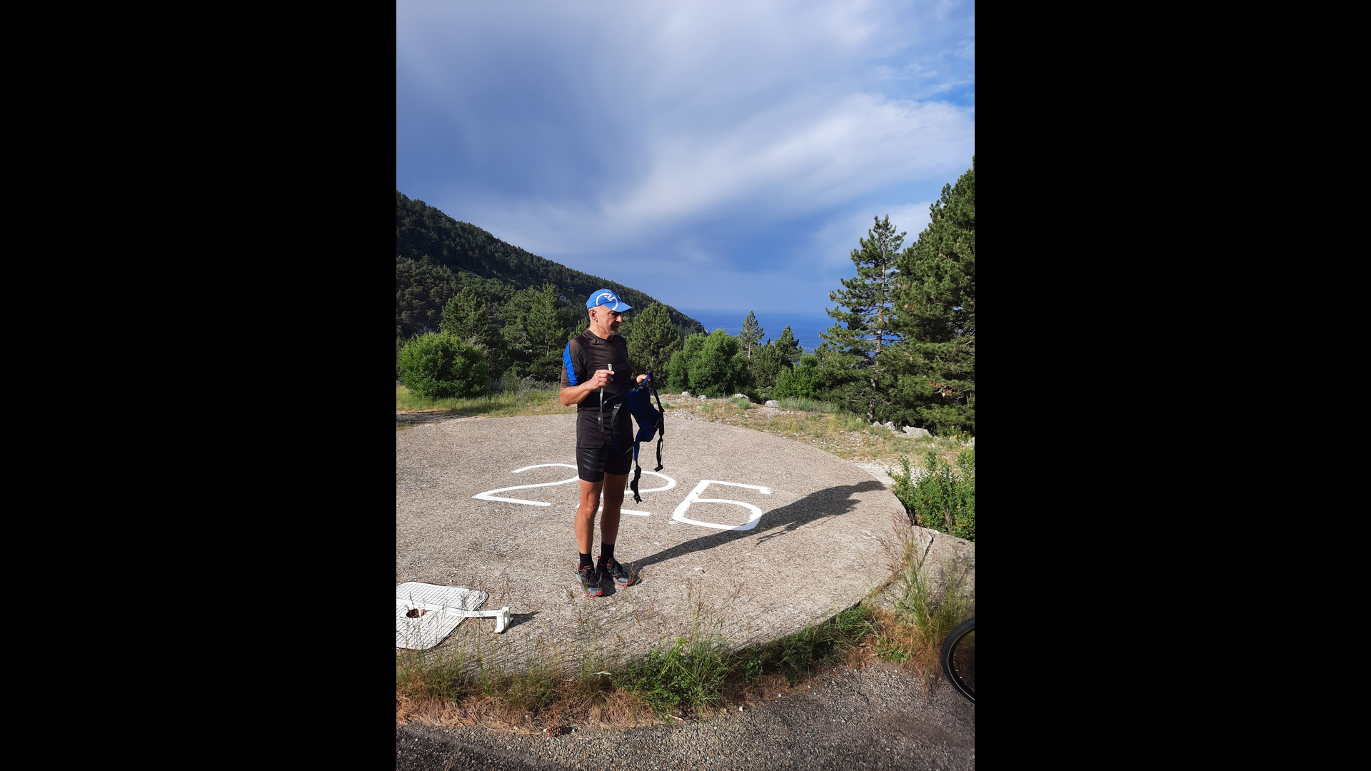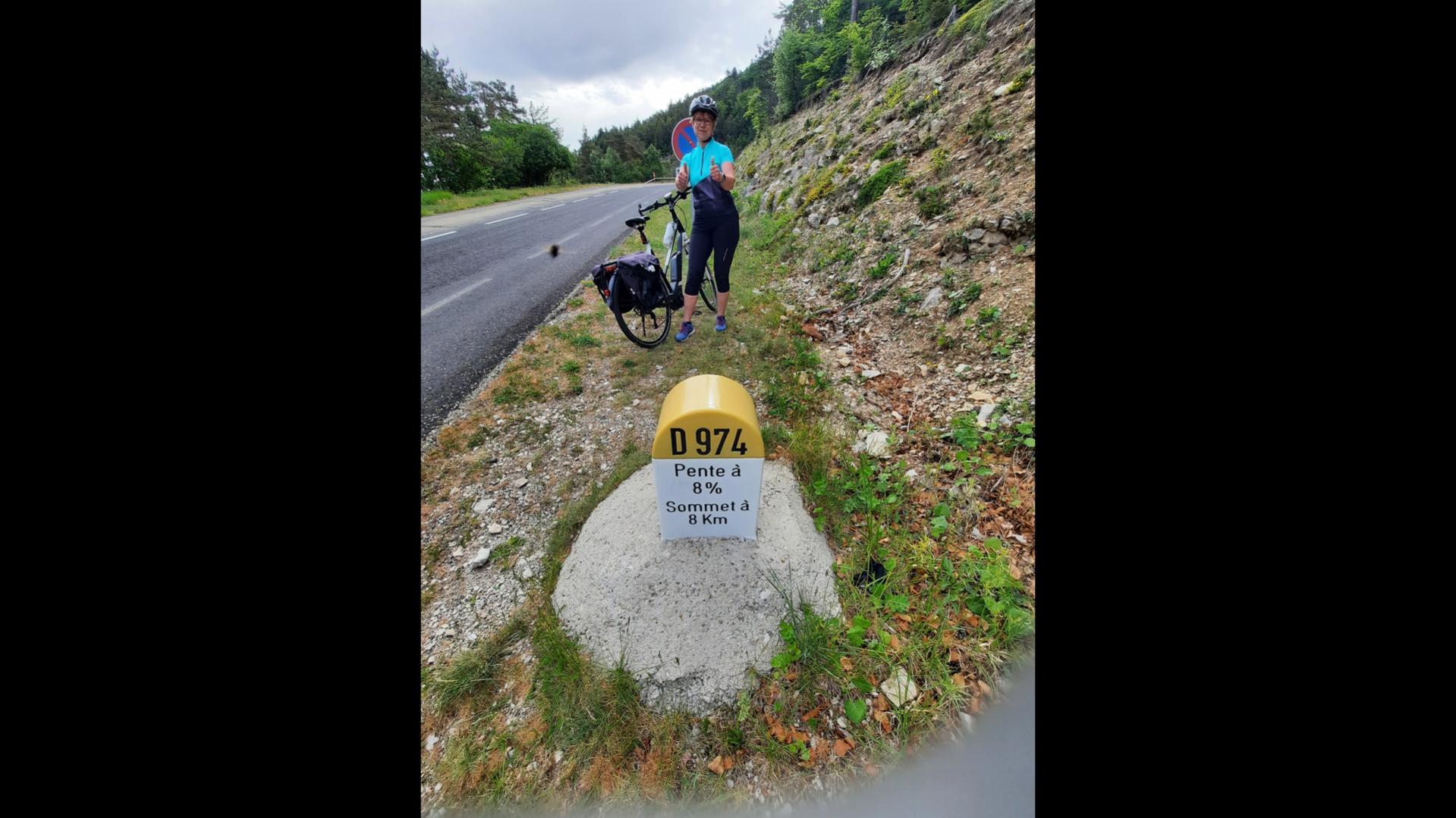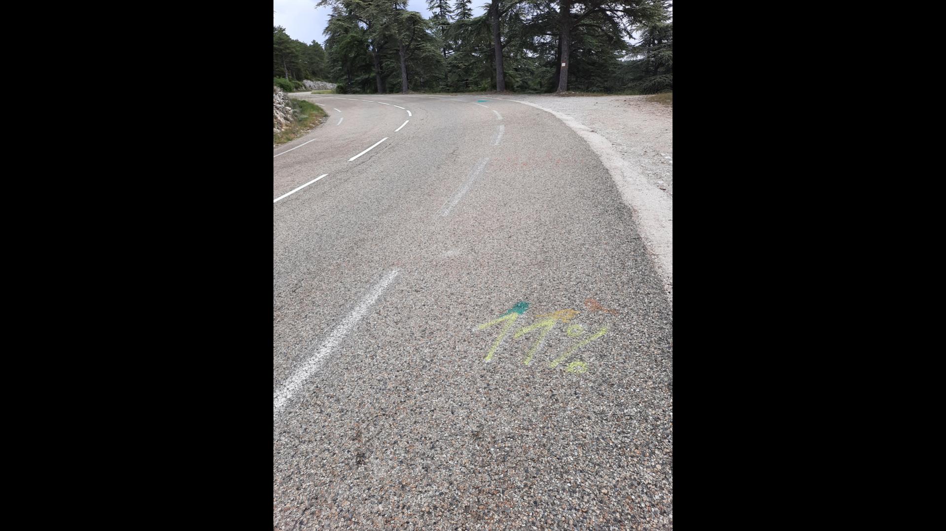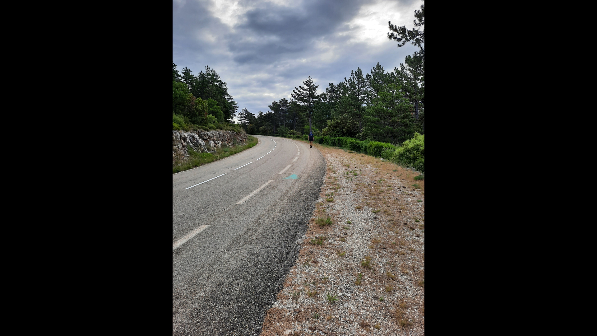 Kurz nach 07.00 Uhr bin ich dann los Richtung Ortszentrum von Malaucene, um dann an der Kreuzung Richtung Mont Ventoux die Uhr zu starten und loszulaufen. Ich war gaaanz allein auf der Strasse nach oben unterwegs, kein Auto, kein Radfahrer und schon gar kein Läufer. :-):-):-) Die ersten Kilometer lief ich sowas von locker aufwärts. Es nieselte ganz leicht, Temperatur war wohl ca. 15 Grad (genau mein Wetter) und mein Kopf war frei und die Beine herrlich locker. Ich war hin- und hergerissen. Lauf ich bis hoch gibt es RICHTIG Ärger mit meiner Frau (wegen der ausgemachten Zeiten), laufe ich NICHT bis hoch, gibt es bis in alle Ewigkeit Ärger mit meinem Kopf, von wegen Gipfel NICHT erreicht. Ich wusste bis Km 8 NICHT, was ich machen sollte. Dann wurde mir die Entscheidung abgenommen, ich hörte hinter mir eine Fahrradklingel und dachte so bei mir, nanu, die Strasse ist doch frei und ein Rennrad mit Klingel wäre schon sehr ungewöhnlich und dann kam die für mich SEHR POSITIVE Überraschung.