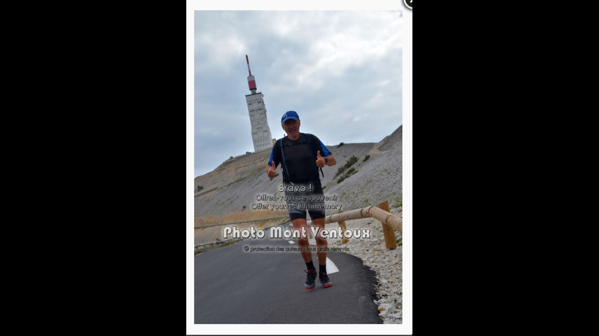 Auf jeden Fall machte ich mich dann zu Fuss auf den Weg nach Malaucene, frohen Mutes und voller Adrenalin begann ich ich abwärts zu laufen. Nach ca. 500m kam mir dann o.g. Fotograf wieder entgegen und knipste mich wiederum mehrmals und jetzt gab er mir sogar seine Visitenkarte. Jetzt hatte ich sogar einen Fotobeweis, der Turm des Mont Ventoux und ich auf einem Bild. Das ich das erleben darf. WAHNSINN!!!