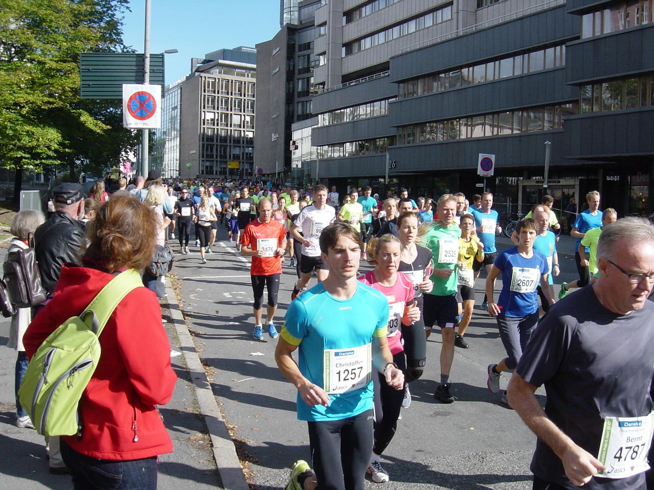 Ohne großes Zeitpolster machen sich die Teilnehmer „Halvmaraton“ am nächsten Tag auf den 20-Minuten-Fußweg zum Rådhusplassen. Der Platz um das Startareal zwischen Rathaus und Hafen ist mit Menschenmassen angefüllt. Nach der Kleiderbeutelabgabe ist es höchste Zeit auf die Start-Straßenseite zu kommen und den richtigen von neun Startblöcken beim HM zu finden. Fatalerweise wird gerade die Straßenseite zwischen Beutelabgabe und Starterfeld von den Marathonläufern auf der zweiten Runde benutzt. Die Zeit ist knapp. Ich klettere wie andere HM-Starter über die erste Absperrung, schlängele mich quer durch die 42er Läufer, überwinde die zweite und lande so irgendwo unter den 8.000 Startern. Die ersten davon befinden sich schon auf der Strecke und alle drei Minuten wird eine weitere Gruppe auf den Weg geschickt. Das Wetter konnte bei dieser Veranstaltung am 21. September 2013 in Oslo gar nicht besser sein: Windstill, sonnig und knapp über 10 °C. Die Strecke ist ein attraktiver Rundkurs durch Stadtteile mit verschiedener Nutzung. Im Zentrum die Verwaltung, Wohngebiete unterschiedlicher Art, Fährhafen, das 1987 eröffnete Einkaufs- und Amüsierviertel Aker Brygge, Containerhafen, Botanischer Garten und die Karl Johans gate, die Haupt- und Prachtstraße der Innenstadt von Oslo. An Sehenswürdigkeiten befinden sich Rathaus, Akershusfestung, Oper, Parlament, in einiger Entfernung in der Verlängerung der Karl Johans gate „Det Kongelige Slott“ und zahlreiche Skulpturen an der Strecke.