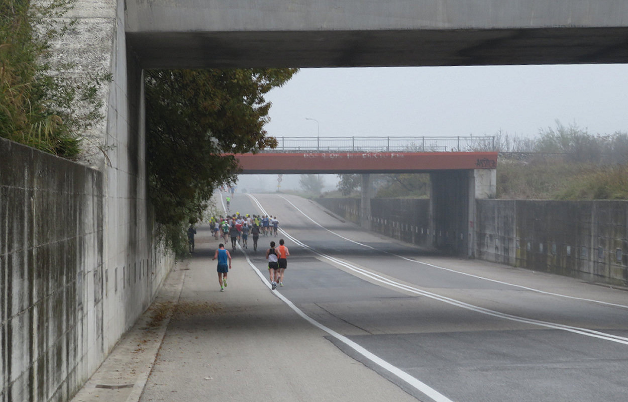 Nach dem sandigen Park ging's kurz zurück auf die Via Roma und Asphalt, dann aber gleich rechts ab in die verwinkelte Altstadt. Dort waren einige gepflasterte Abschnitte und viele Kurven, saubere Lauftechnik war erforderlich. Auf die Sehenswürdigkeiten konnte ich nicht viel schauen, der Verkehr war immer noch dicht und das Pflaster stellt schon seine Herausforderungen - dennoch war es nett, an vielen der Bauwerke vorbeizutrappeln, die wir schon besichtigt hatten. In diesem Bereich war auch einiges an Zuschauern, trotz des Pflasters also ein sehr angenehmer und abwechslungsreicher Abschnitt des Kurses! Interessanterweise gab es in der gesamten Altstadt keine Kontrollmatte, wer also abkürzen hätte wollen konnte einfach die Via Roma weiterlaufen, wohin wir bei km11 auch wieder einbogen. Endlich wieder Asphalt! Ich beschleunigte den Rhythmus. Ab jetzt ging es diese Hauptstraße und ihre Verlängerung entlang hinaus aus der Stadt in die Ortschaft Classe; ein ca. 4km langer Abschnitt, den ich mit der Elisabeth schon am Freitag hinausgewandert war - dort liegt nämlich die beeindruckende Basilika "San Appolinaris in Classe". Am Lauftag war davon nur leider nichts zu sehen, schon die Läufer 200m vor mir waren im Nebel kaum mehr auszumachen - von den gelben 3:00 Pacerballons war ohnehin keine Spur. Das machte mir ein bisschen Sorgen - ich laufe ja ohne Uhr, hätte mich in diesem Moment aber nicht so weit hinten eingeschätzt dass ich die Typen nicht einmal sehe! Zweifel begannen an mir zu nagen ... aber nutzt nix, ich blieb auf Zug und überholte Läufer um Läufer. Auf der Gegenspur kamen uns unter großem Begleitaufwand die Führenden entgegen.