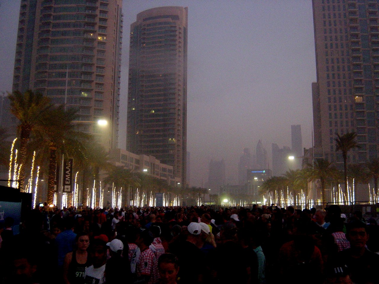 Zu einer Laufveranstaltung gehört auch ein Ritual. Und das ist für mich die Ausgabe der Startunterlagen am Vortag. Das, was die Organisatoren der Dubai-Laufveranstaltung auf die Beine gestellt haben, ist ein richtiges Präludium. Ort ist das Marriott Marquis Hotel, im Laufveranstaltungs-Programmheft als Official Race Hotel bezeichnet. Die Doppeltürme sind mit einer Höhe von 355 Metern das höchste Hotel der Welt. Im großen Bankettsaal mit außerirdisch wirkender Beleuchtung werden die Startnummern den Athleten übergeben. Insgesamt warten in diesem Luxushotel 1608 Zimmer auf Gäste. Ob viele Ausdauersportler hier absteigen, mag ich bezweifeln, denn die Preise für ein DZ, 2 Personen, fangen bei 400 Euro pro Nacht an.
