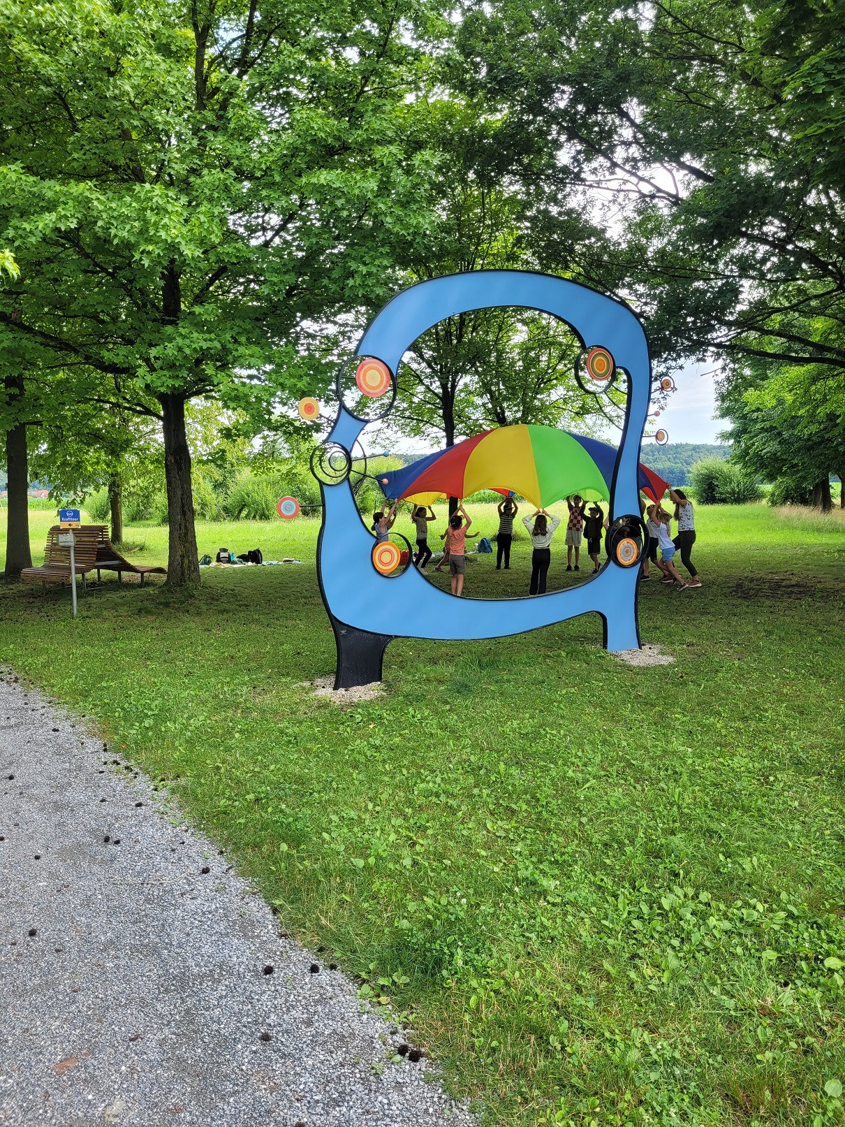 kleine Wasserdusche. Vorbei an einigen Sitzgelegenheiten und Campingplätzen (von Teilnehmern genutzt), geht es noch