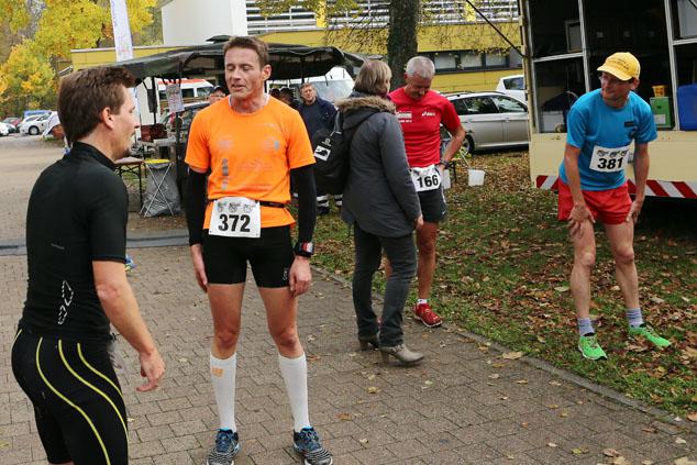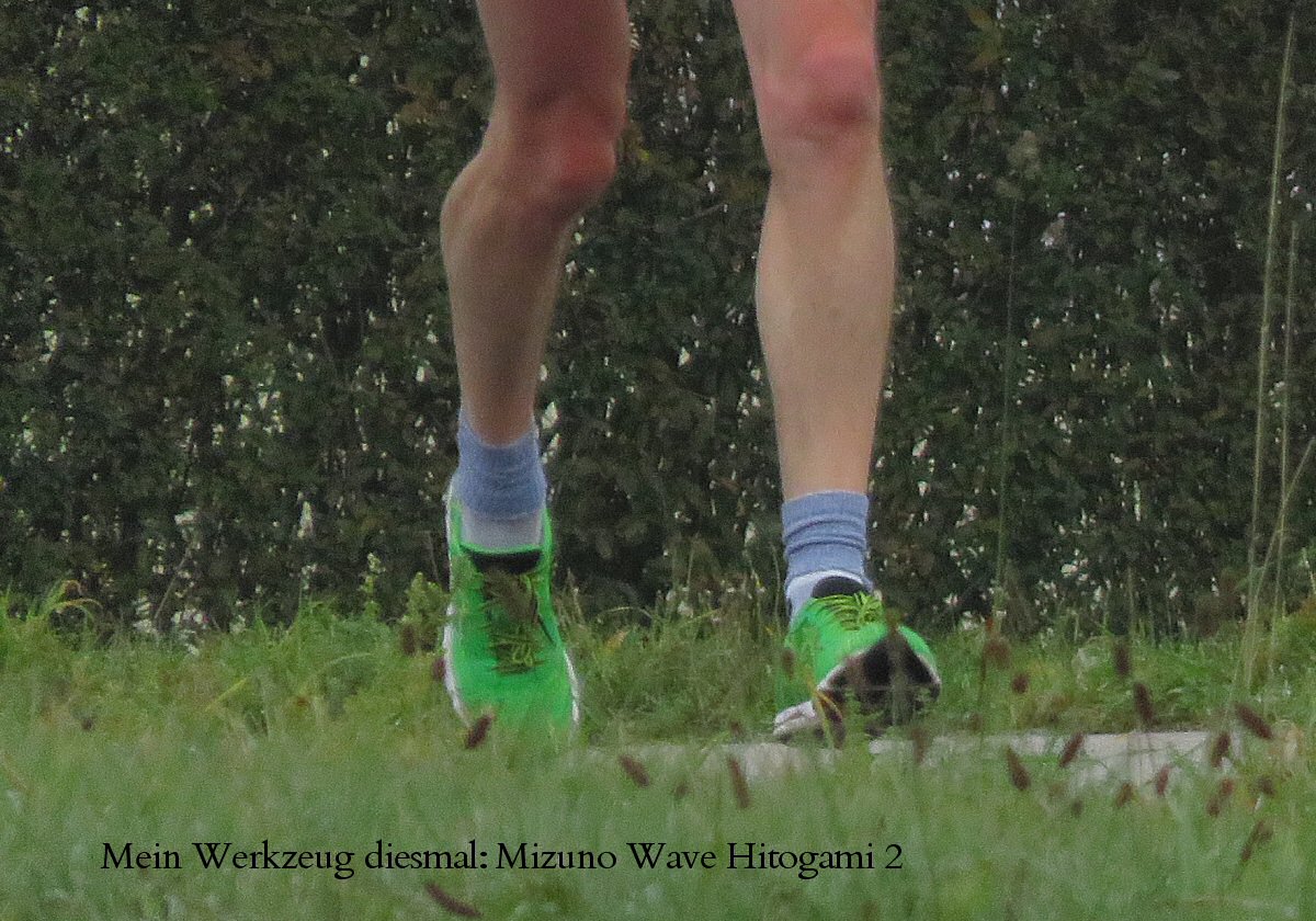 Erst gegen 9:45 tauchte ich wieder am Startgelände auf, warm eingepackt - als Schuhe hatte ich mich für die Mizuno Hitogami2 entschieden, vernünftige Wahl wie sich später herausstellte; die waren zwar recht rutschig aber mit einem leichteren Schuh wäre ich auf manchen Schotterpassagen nicht glücklich geworden. Das Nieseln hatte aufgehört; dennoch hatte ich mein Schirmkäppi auf - als Brillenträger bin ich da vorsichtig, sogar leichter Regen bedeutet schlechte Sicht ohne Käppi. Ansonsten natürlich kurz/kurz, gleiche Adjustierung wie vor einer Woche!