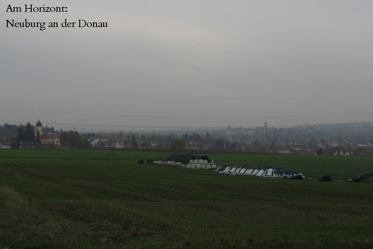 Der Hochnebel fing an sich zu lichten und fast wäre sogar die Sonne ein wenig durchgekommen, aber ganz hat's nicht gereicht. In Unterstall (km19) gönnte ich mir versuchsweise ein paar Schluck Iso an der Verpflegungsstation, das tat mir aber nicht gut - ich sollte wirklich beim Wasser bleiben! Hinter Unterstall ging's in ein paar weiten Schwüngen über die letzte Hügelkuppe und dann kam Neuburg in Sicht.