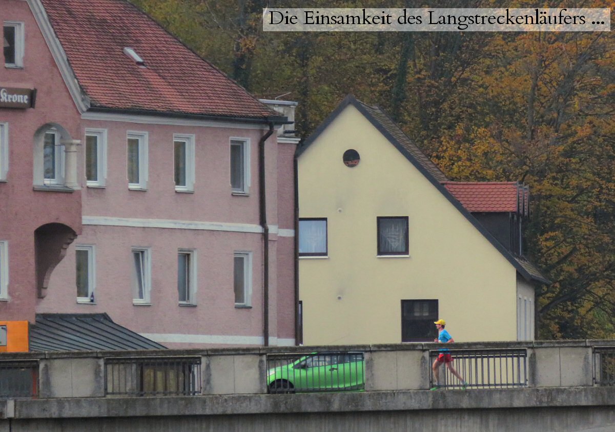 Zu diesem Zeitpunkt war ich zusammen mit zwei Kollegen am Weg, die von hinten aufgelaufen waren; zusammen machten wir ein schönes Tempo. Es tat auch ganz gut, zu dritt zu laufen, denn in diesem Bereich wehte uns ein kräftiger Südwind entgegen. Bei km 21 ging's zurück auf die Hauptstraße - allerdings nur für einen km, denn dann macht der Kurs noch einen Bogen weg von der Ingolstädter Straße, die ansonsten schnurgerade zur Donau führen würde. Bei km 23 beginnt dann die Elisenbrücke; über die Leopoldineninsel ging's zur Altstadt (wo meine Elisabeth wieder fotografierte) und dann flussabwärts Richtung Ziel.