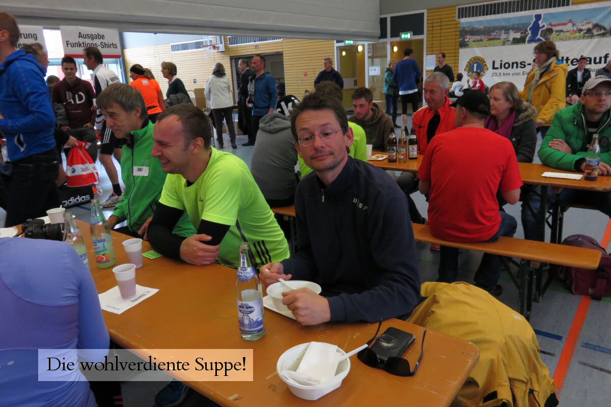 Nach einer Flasche Wasser ging ich erst einmal ordentlich duschen, dann machten wir uns über's Buffet her und konnten noch ein wenig mit den Kollegen plaudern - unter anderem auch mit der Startnummer 1, Rupert Hackl - Lionsclub Neuburg und Mitbegründer des Laufs. Überhaupt war die ganze Atmosphäre in der Sporthalle sehr angenehm, und alles war bestens organisiert.