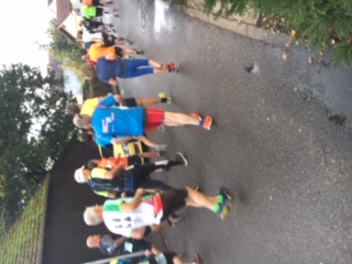 Mit dem kotzgrünen Baumwollhemdle mache ich mich gerade noch rechtzeitig auf den relativ langen Anlaufweg zum Start am Orts-Kreisel. Ursprünglich wollte ich mich ja heute nicht einlaufen, zumal bei der Wärme sich die Poren auch ohne große körperliche Bewegung öffnen. So blieben mir nur noch wenige Minuten rumstehen vorm Start. Um mich herum viele bekannte Gesichter. Da ist unter anderem Klaus N. aus Stuttgart, M70. Zigfacher Comrades Finisher und daher Botschafter für Deutschland, Spartathlon, Trans-Europalauf und Marathonvielläufer. Wir flachsen herum ob meiner baldigen Aufnahme in den Club der 100er. Mit dieser Einsteigerzahl fühle ich mich neben ihm als echter Rookie, da mir mehr als eine Null vorm Komma fehlt um auch nur annähernd an seine Laufbilanz zu kommen. Am 11.11. wird er beim Karnevalslauf in Köln seinen 1111. Marathon/Ultra laufen. Es könnte schwer werden ihn bis zum Ende meiner Lauftage einzuholen oder zumindest gefährlich nahe zu kommen :zwinker2: