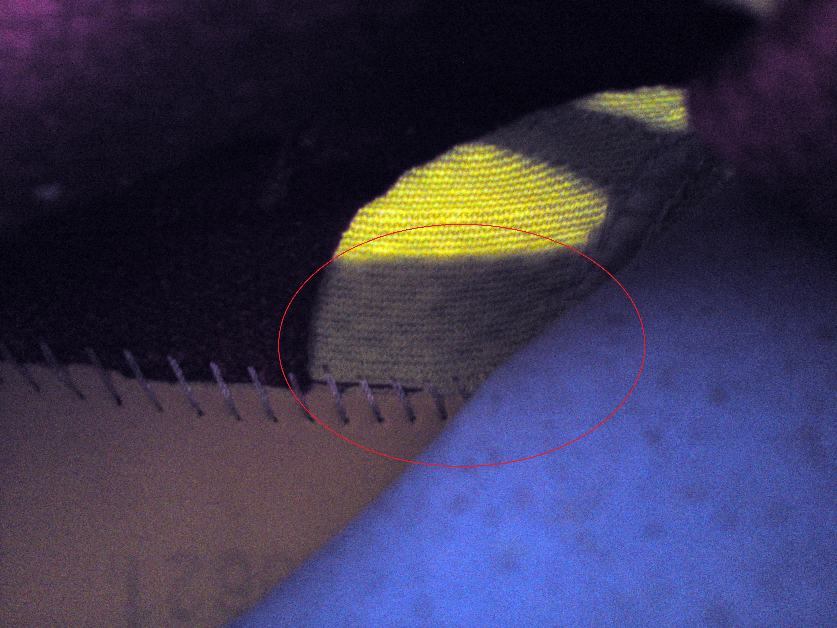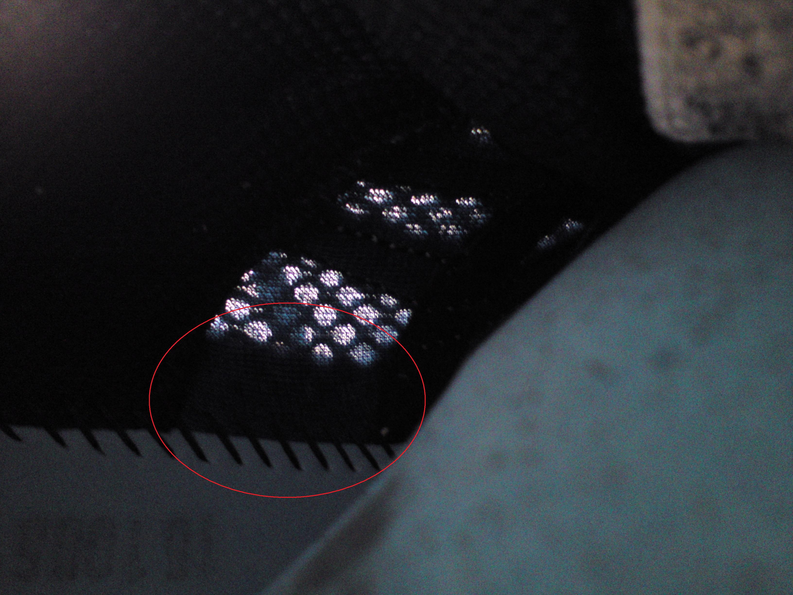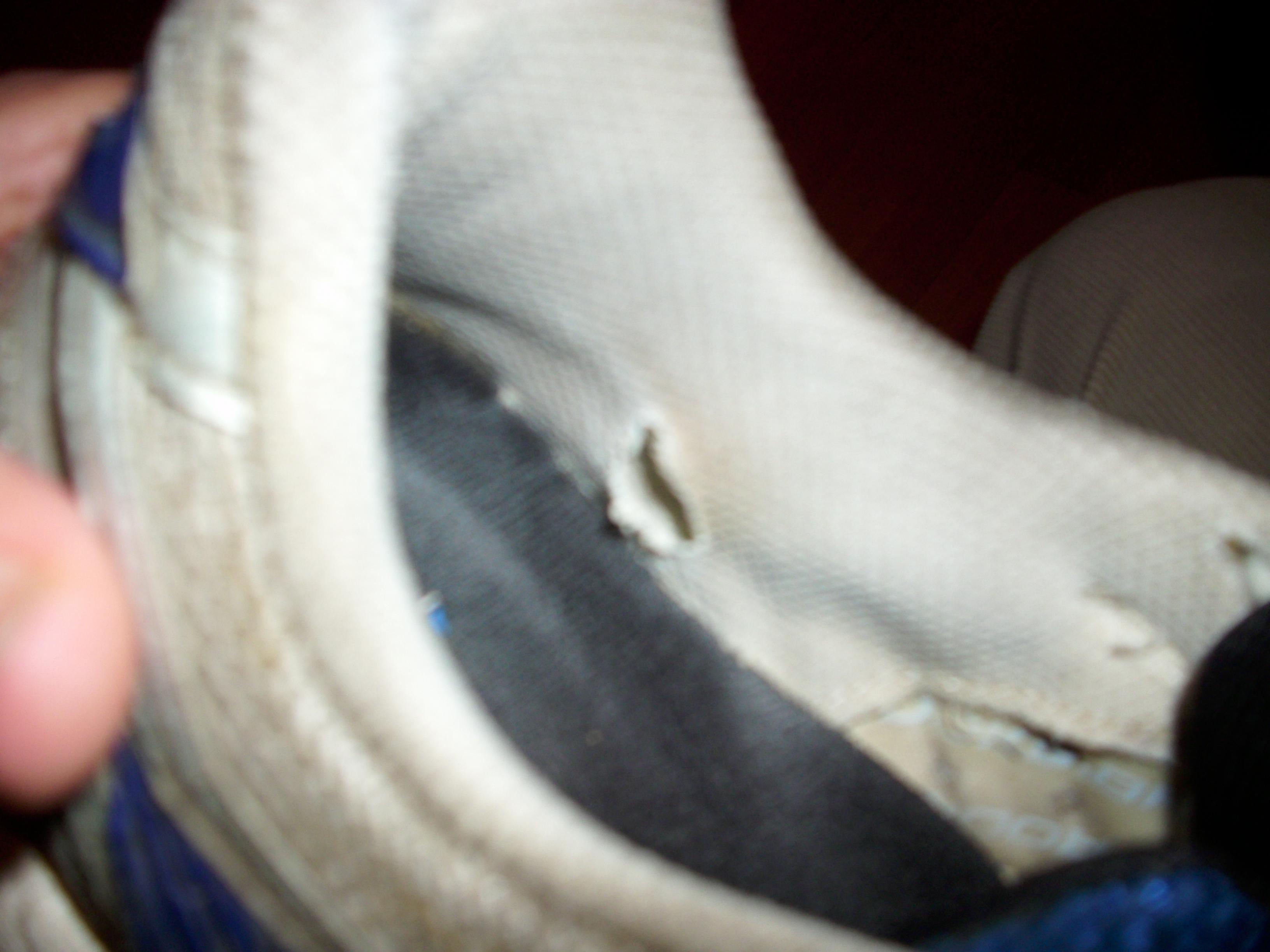 Und genau an dieser Stelle, wo die Stütze ist, scheuert mein Fuß auch. Das war auch schon, bevor der Stoff da durchgescheuert war.