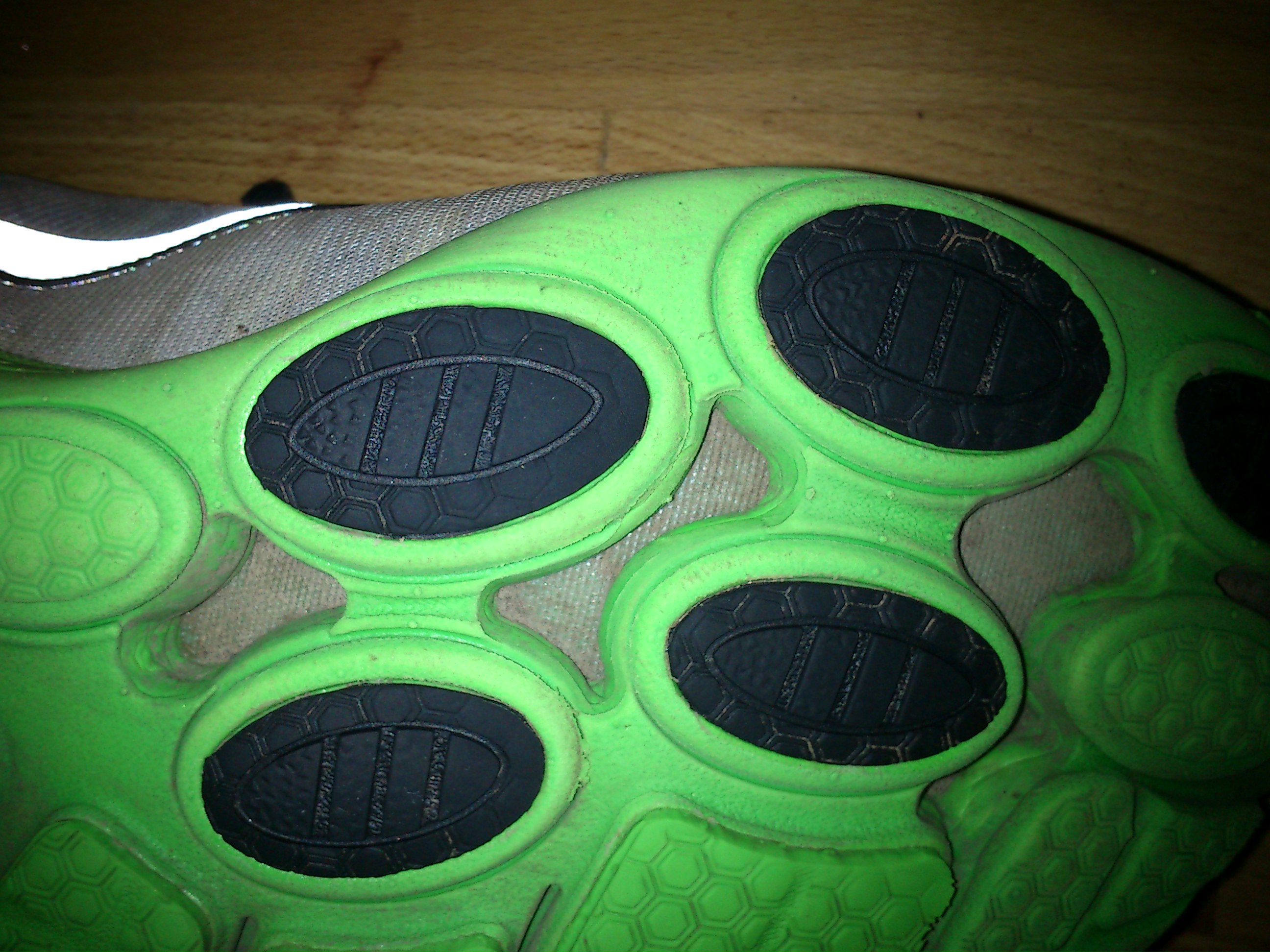 Ich frage mich immer noch, warum der vordere rechte ovale ... wie nenn ich das Ding jetzt ... Nippel? Noppen? nicht auch schwarz besohlt worden ist. Ich habe schon einige Connects gesehen, bei denen die grüne Sohle total abgewetzt war und die schwarze kaum. Wahrscheinlich ist das bei Vorfußläufern extrem der Fall.