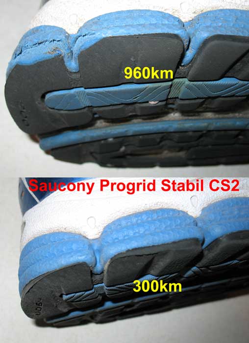 mein erstes Paar Laufschuhe (06/2012 Saucony Progrid Stabil CS2, Laufladen mit Videoanalyse) haben nun 960km auf dem Tacho und haben natürlich Abnutzungserscheinungen. Ich hatte später das Paar noch mal gekauft, diese haben nun 300km drauf und zeigen die gleichen Abnutzungen, jeweils mit Einlagen, siehe auch das Bild im Anhang.